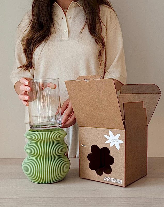 Ваза состоит из двух частей: пластиковой основы и стеклянной колбы внутри. Основная часть вазы напечатана на 3D-принтере из пластика PLA, может быть переработана в будущем. Внутри нее для удобства использования размещена стеклянная колба — ее легко достать и помыть. Так, мы продлеваем срок службы пластиковой вазы и облегчаем уход за ней, а также говорим: вы можете пользоваться этой вазой, как и привычной стеклянной.