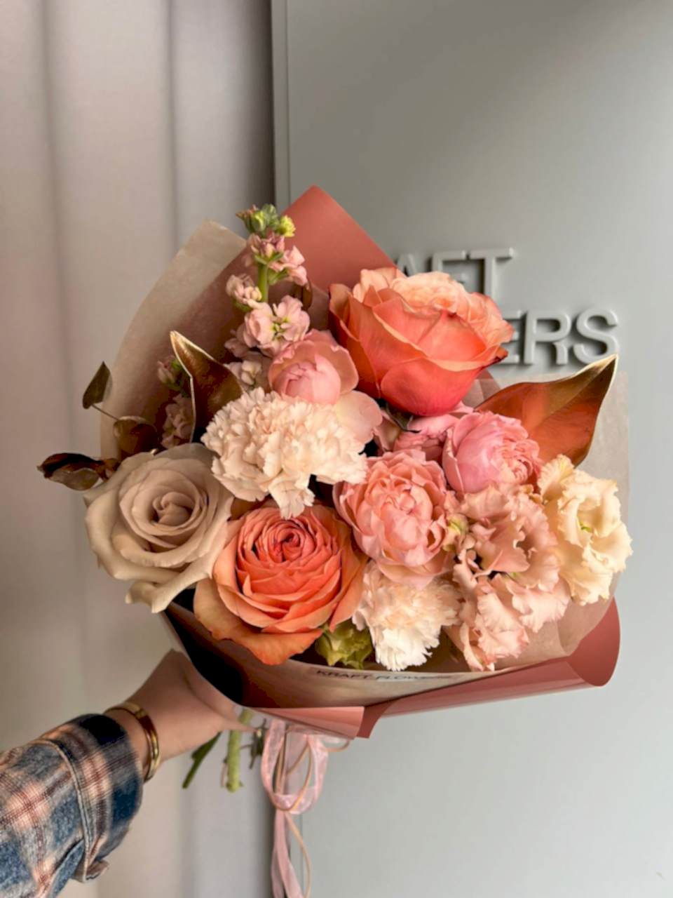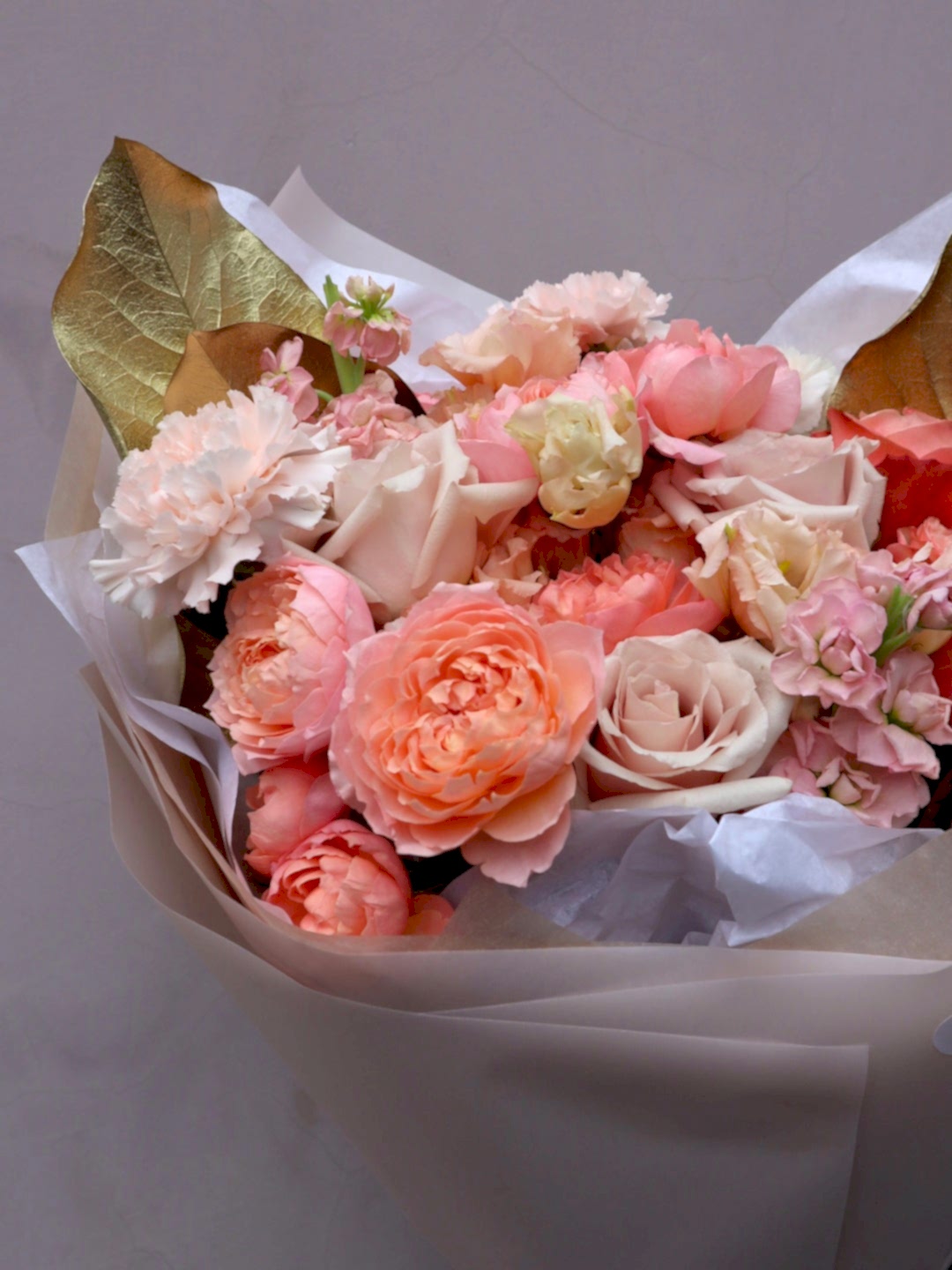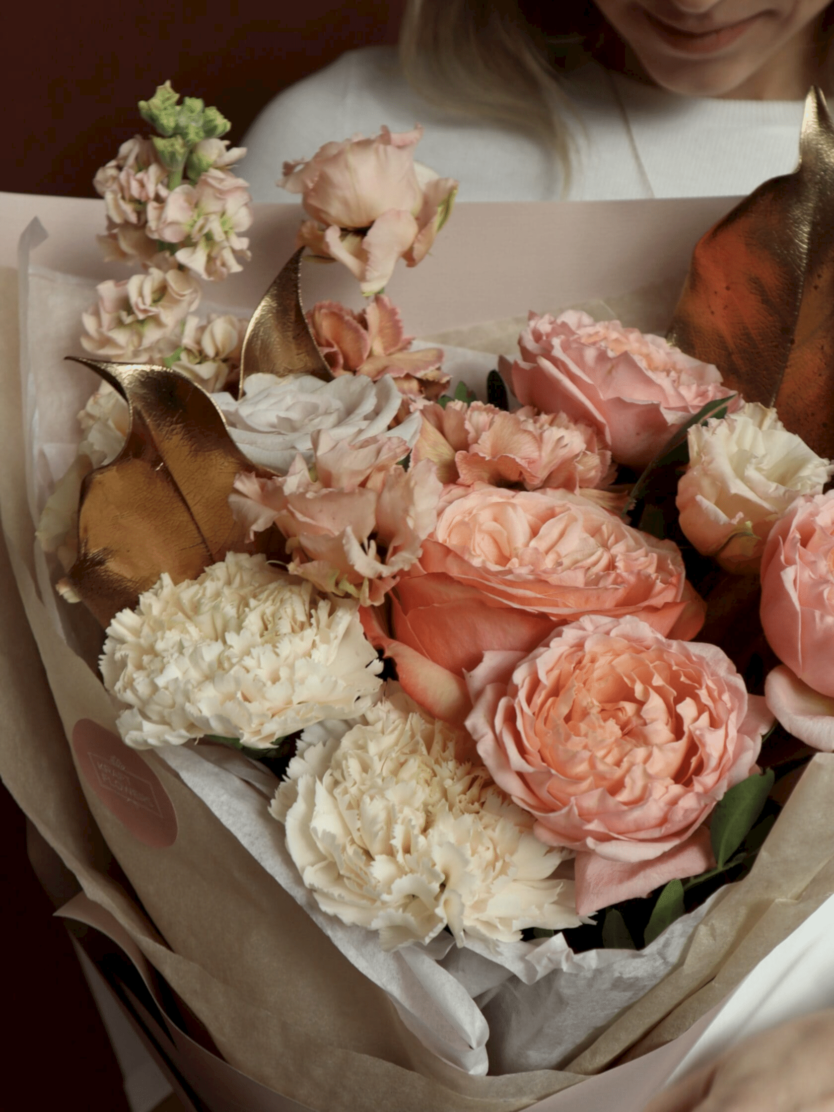 Сочные кремово-персиковые цветы и изящные золотые веточки были созданы друг для друга, поэтому оказались вместе в одном букете!