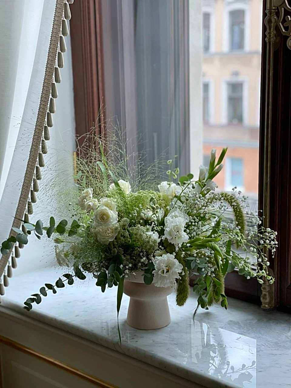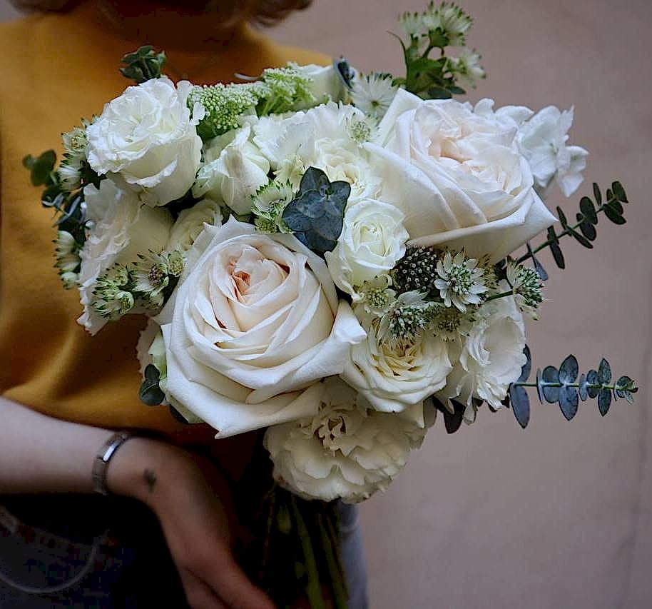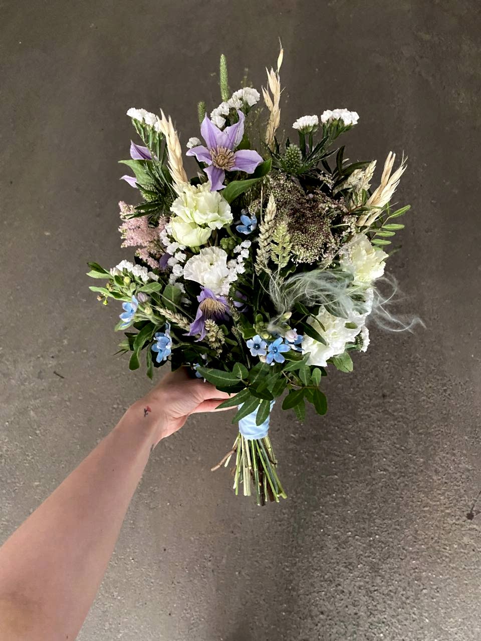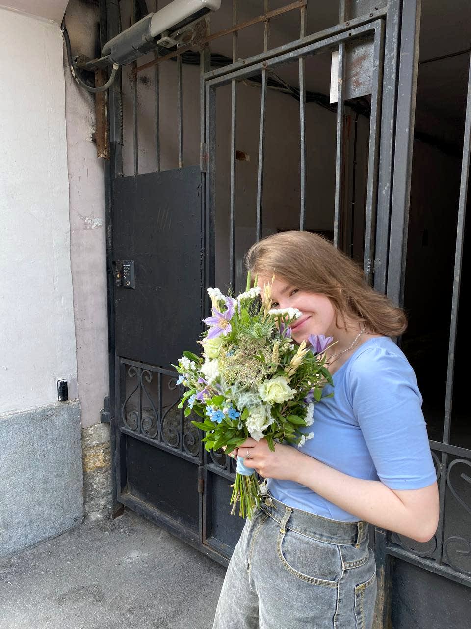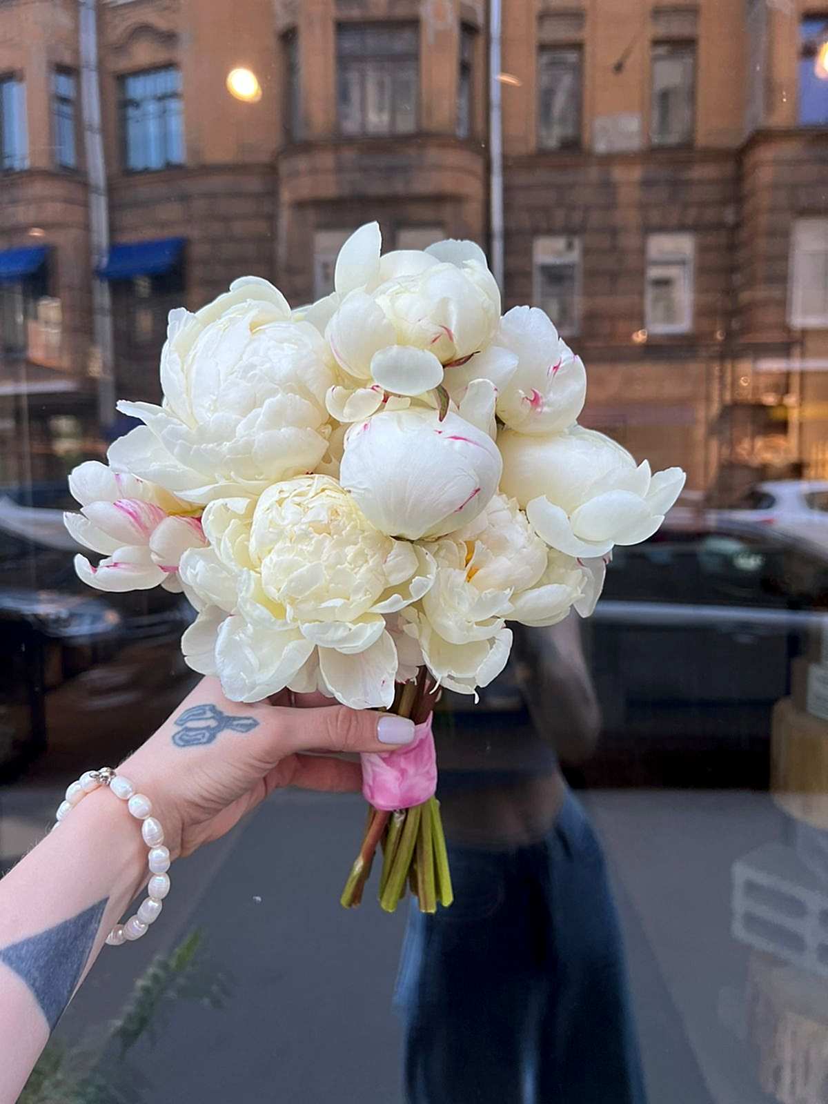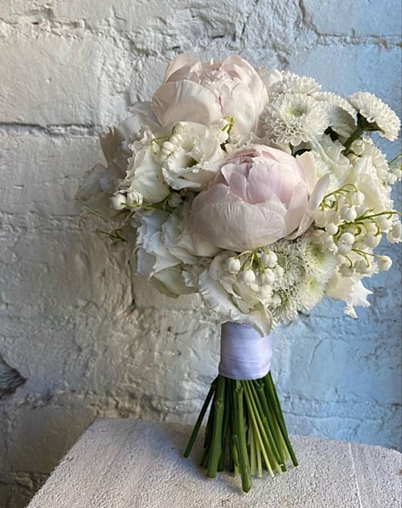 Нежный, но с характером букет с пионом, душистой маттиолой, ажурным лизантусом, кремовыми розами, акцентными колючками эрингиума и колокольчиками клематиса