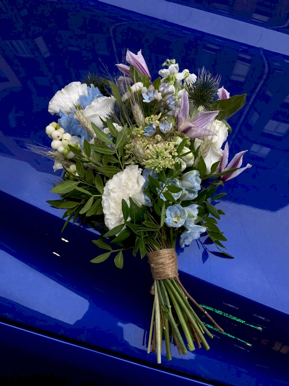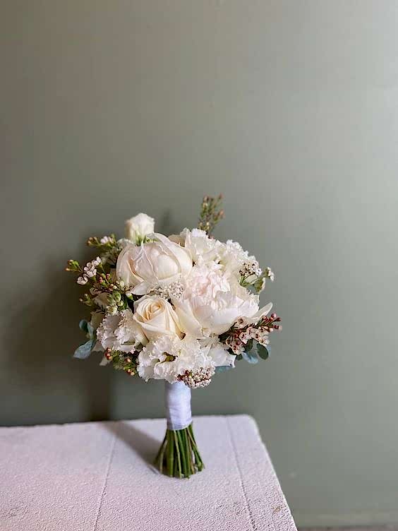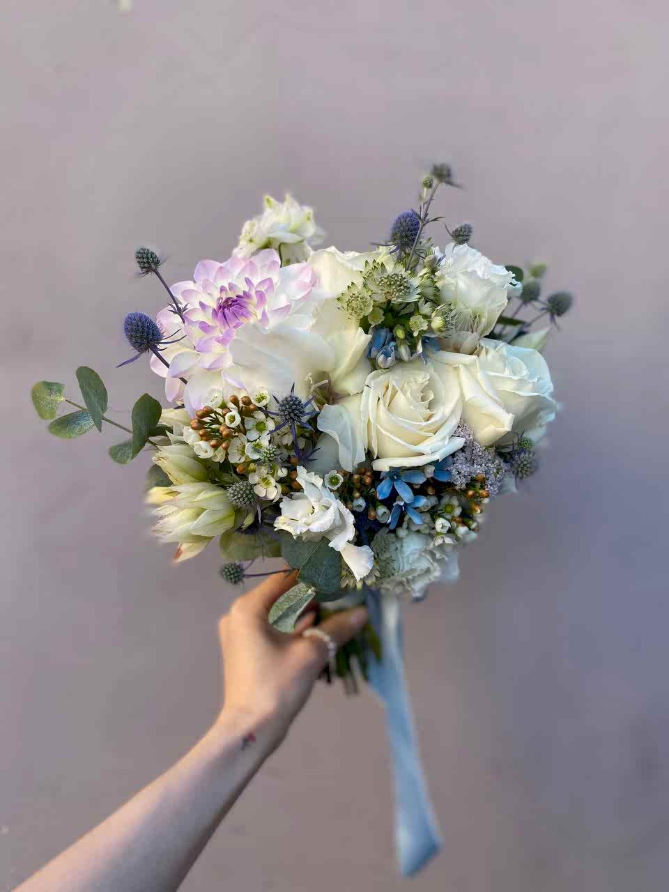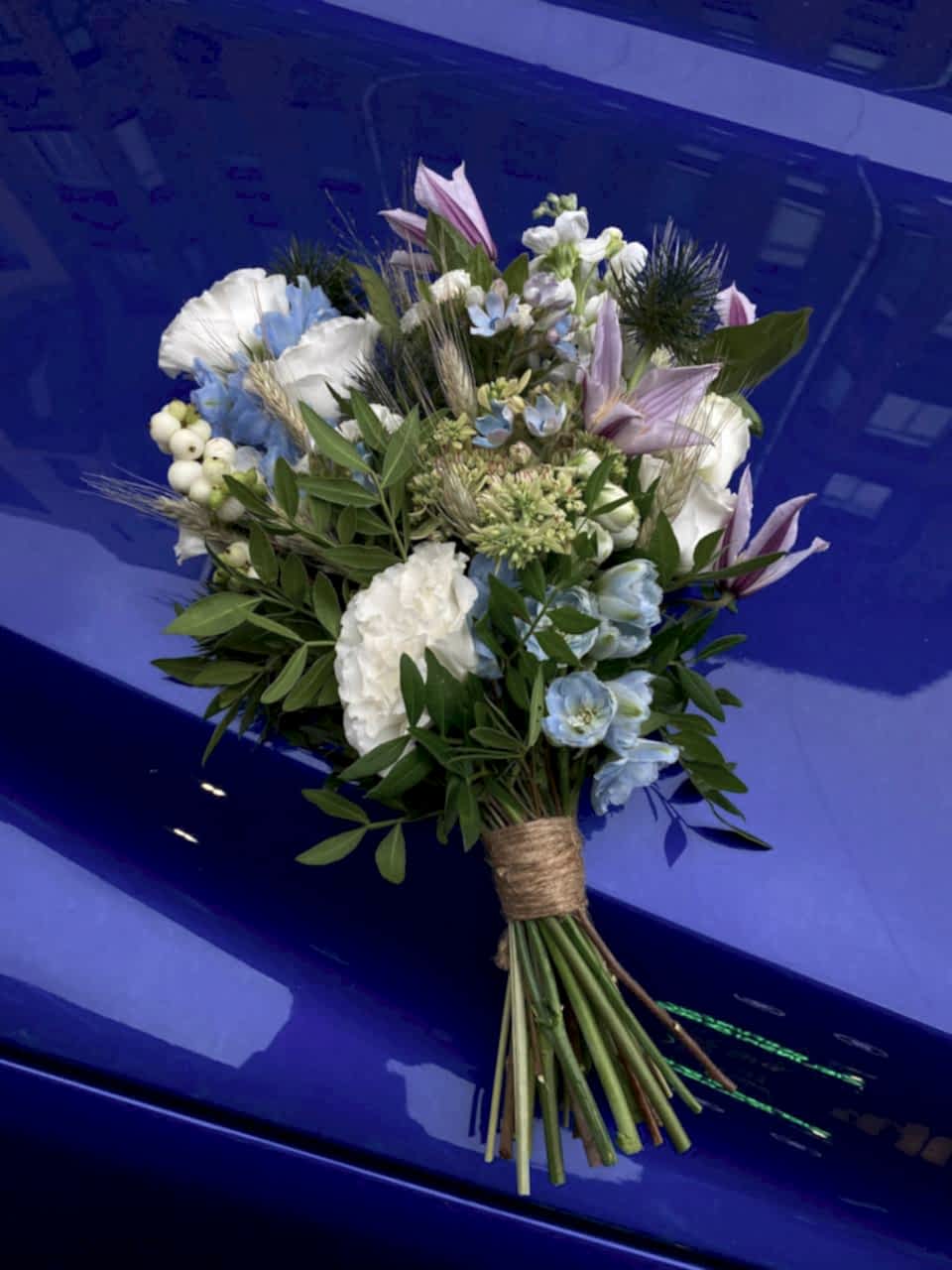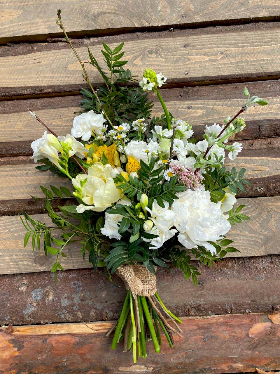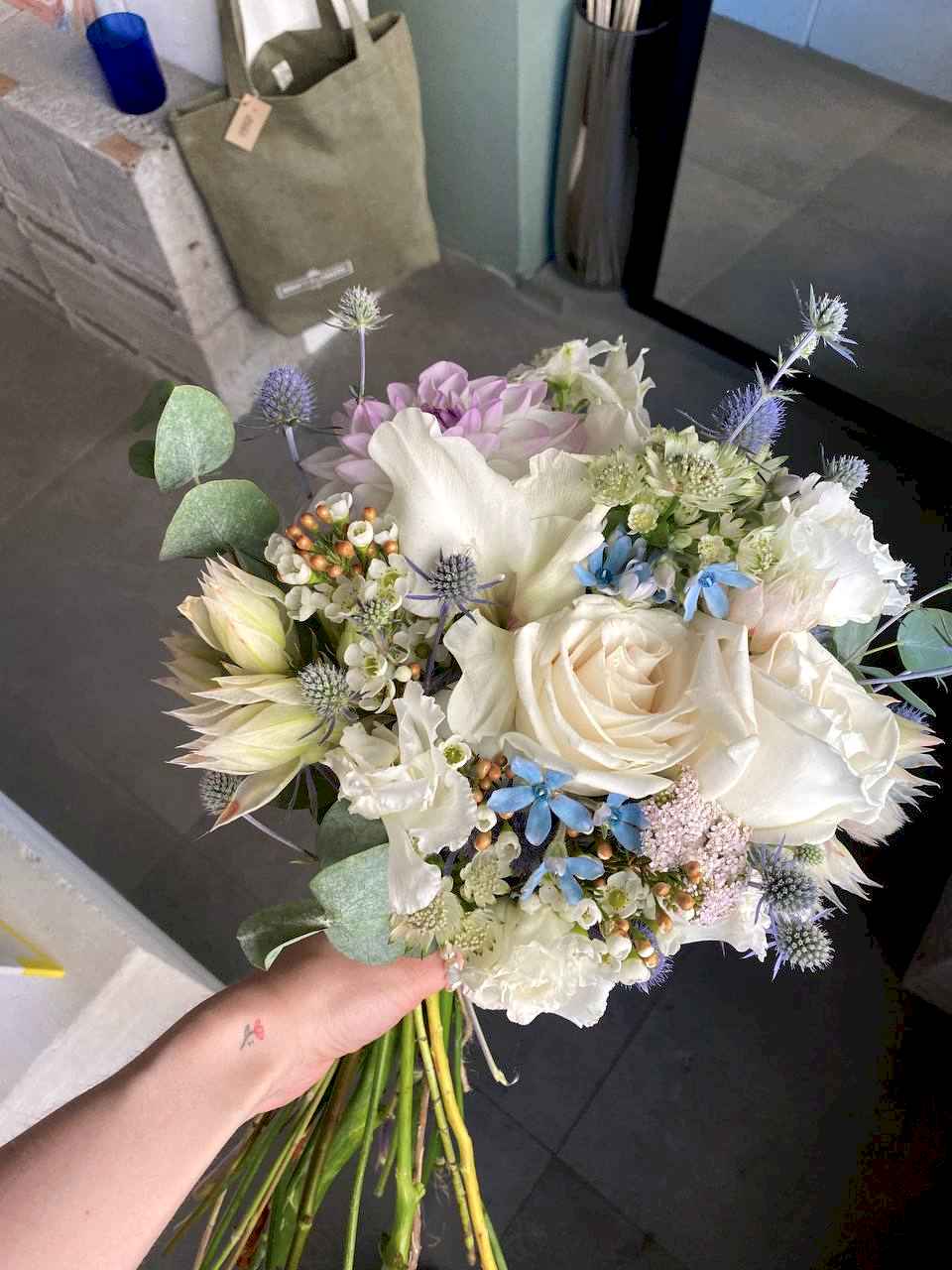 Нежный, но с характером букет с пионом, душистой маттиолой, ажурным лизантусом, кремовыми розами, акцентными колючками эрингиума и колокольчиками клематиса