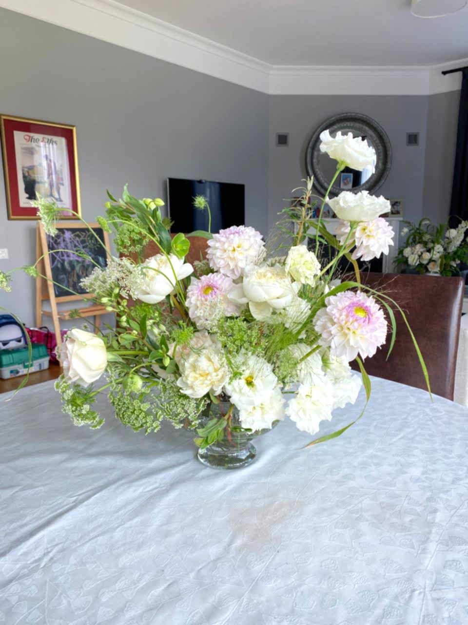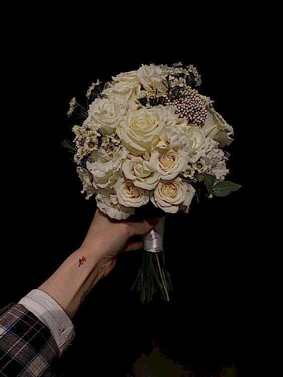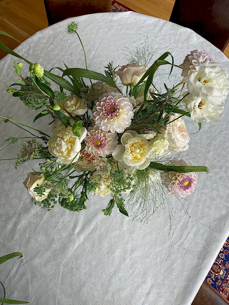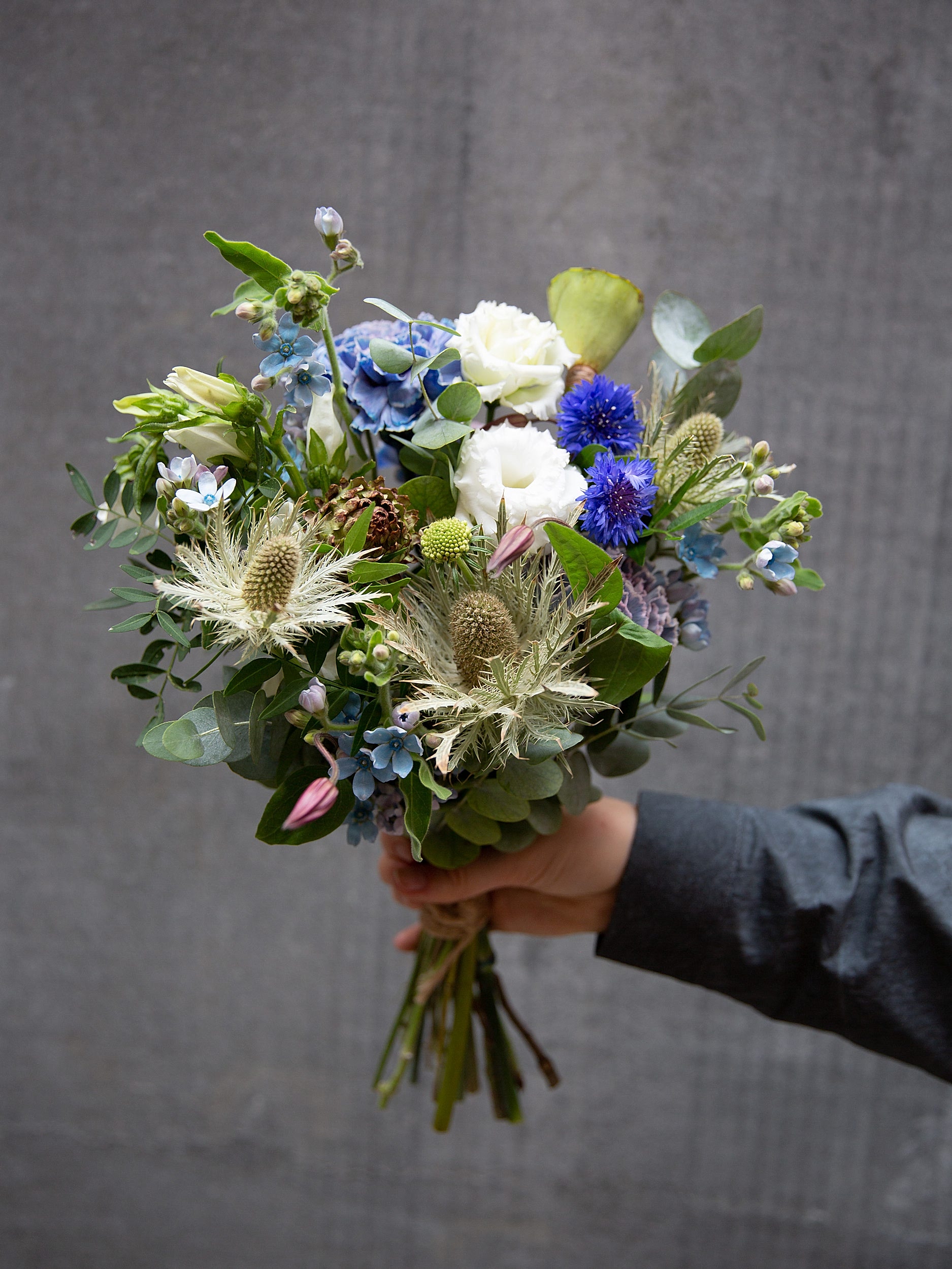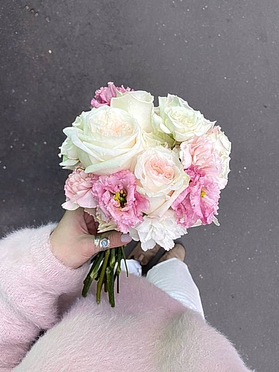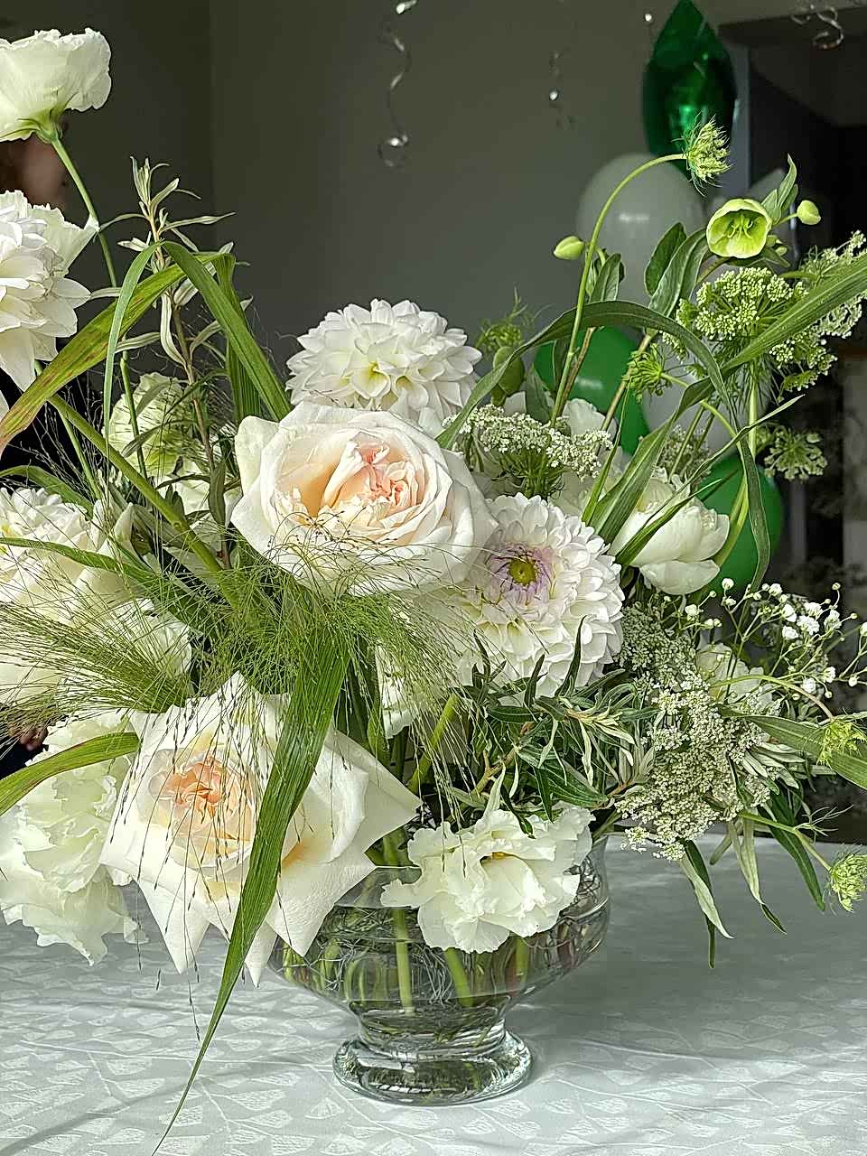 Нежный, но с характером букет с пионом, душистой маттиолой, ажурным лизантусом, кремовыми розами, акцентными колючками эрингиума и колокольчиками клематиса