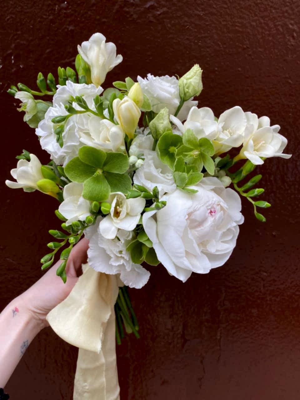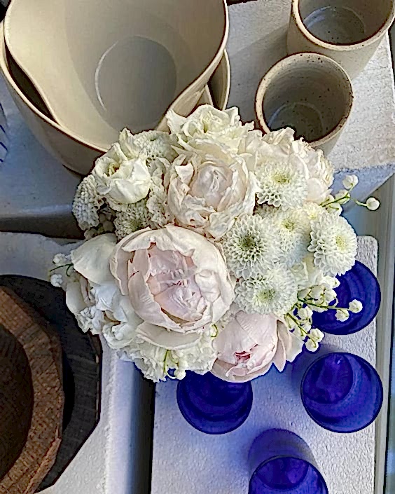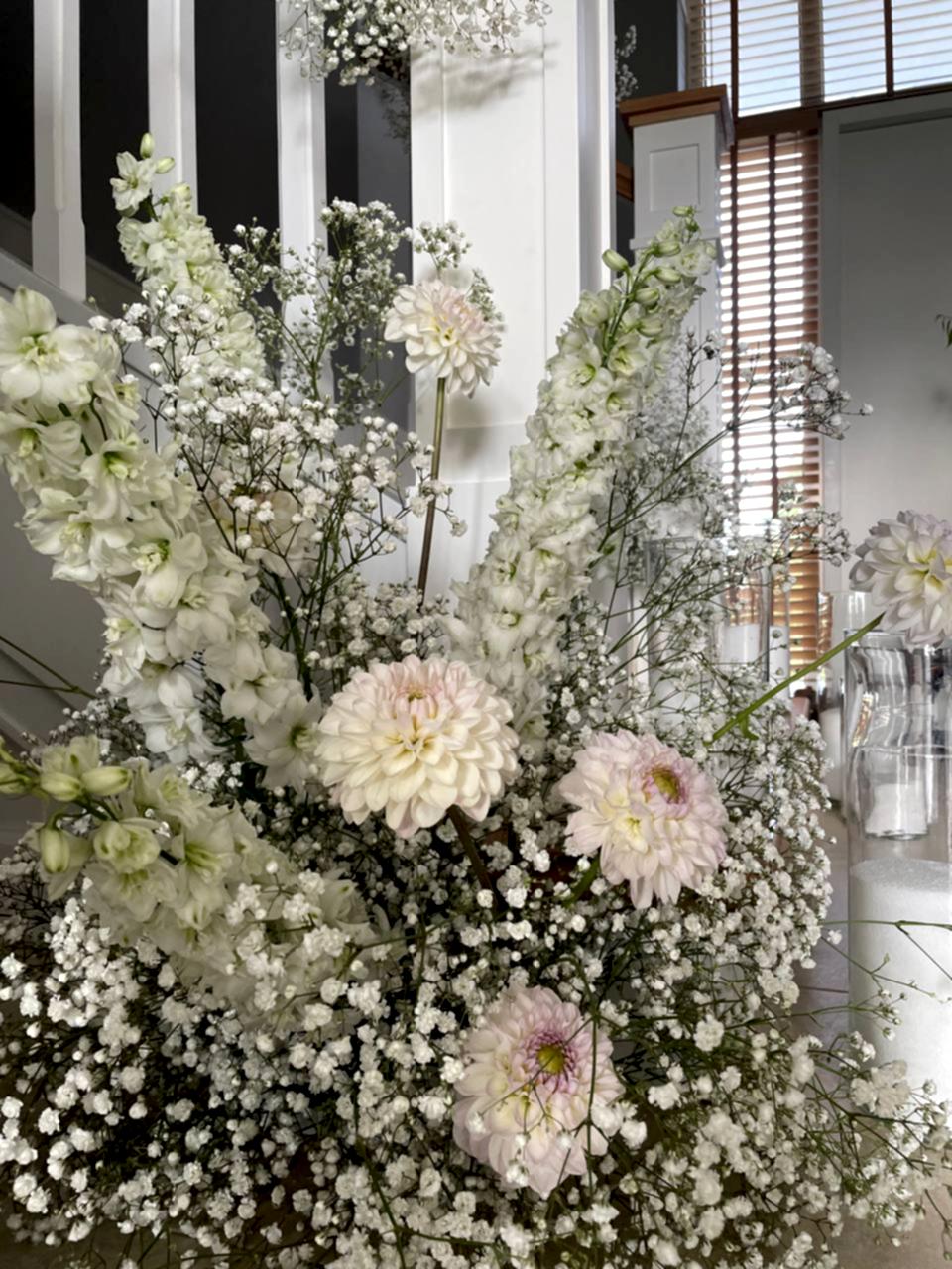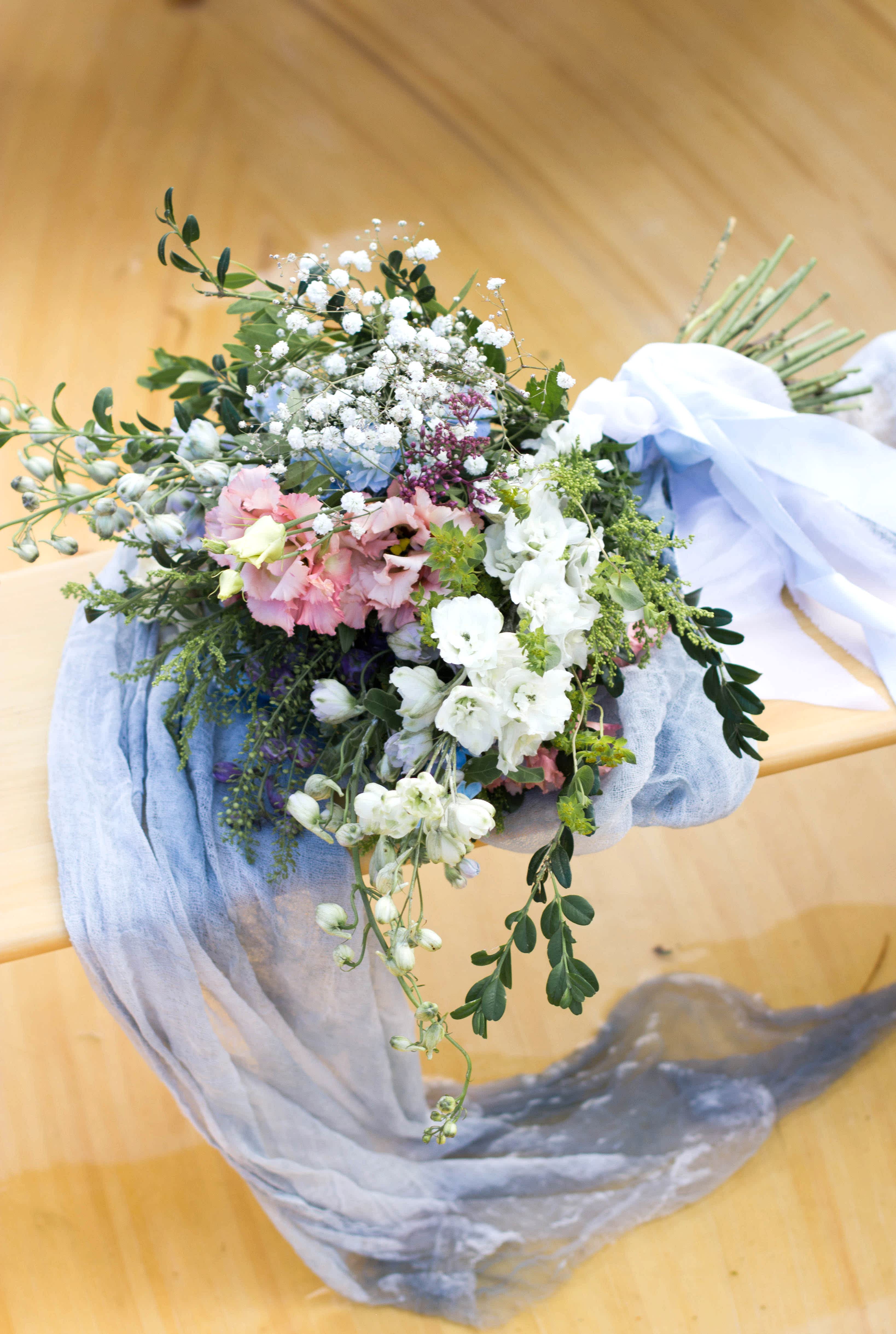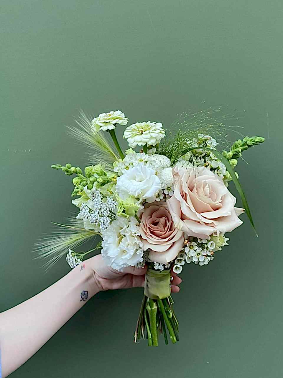Нежный, но с характером букет с пионом, душистой маттиолой, ажурным лизантусом, кремовыми розами, акцентными колючками эрингиума и колокольчиками клематиса