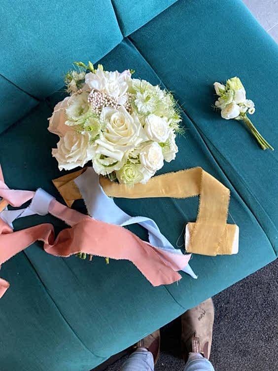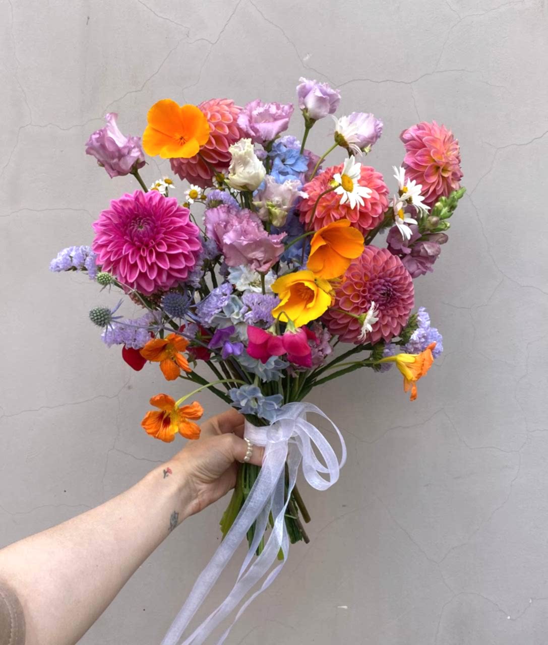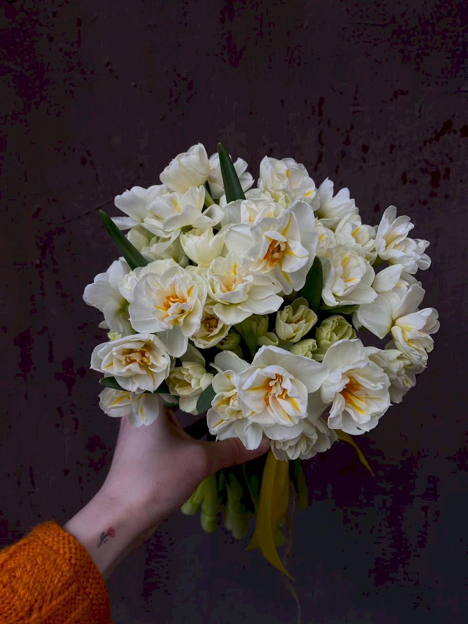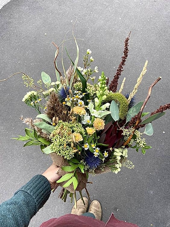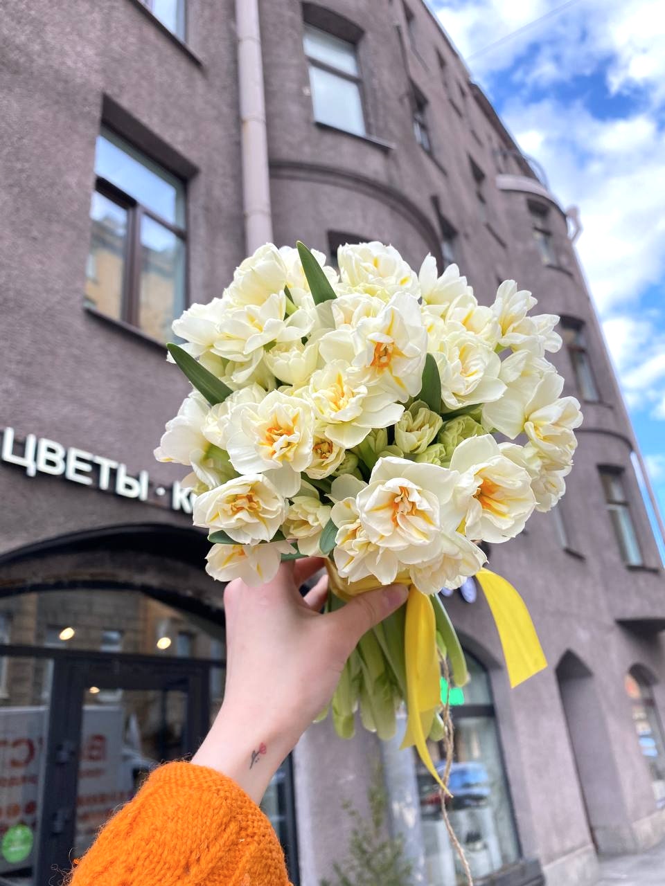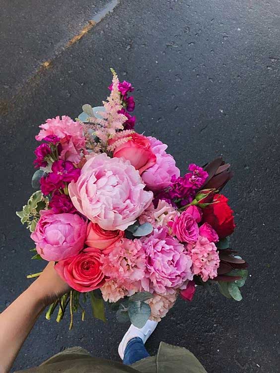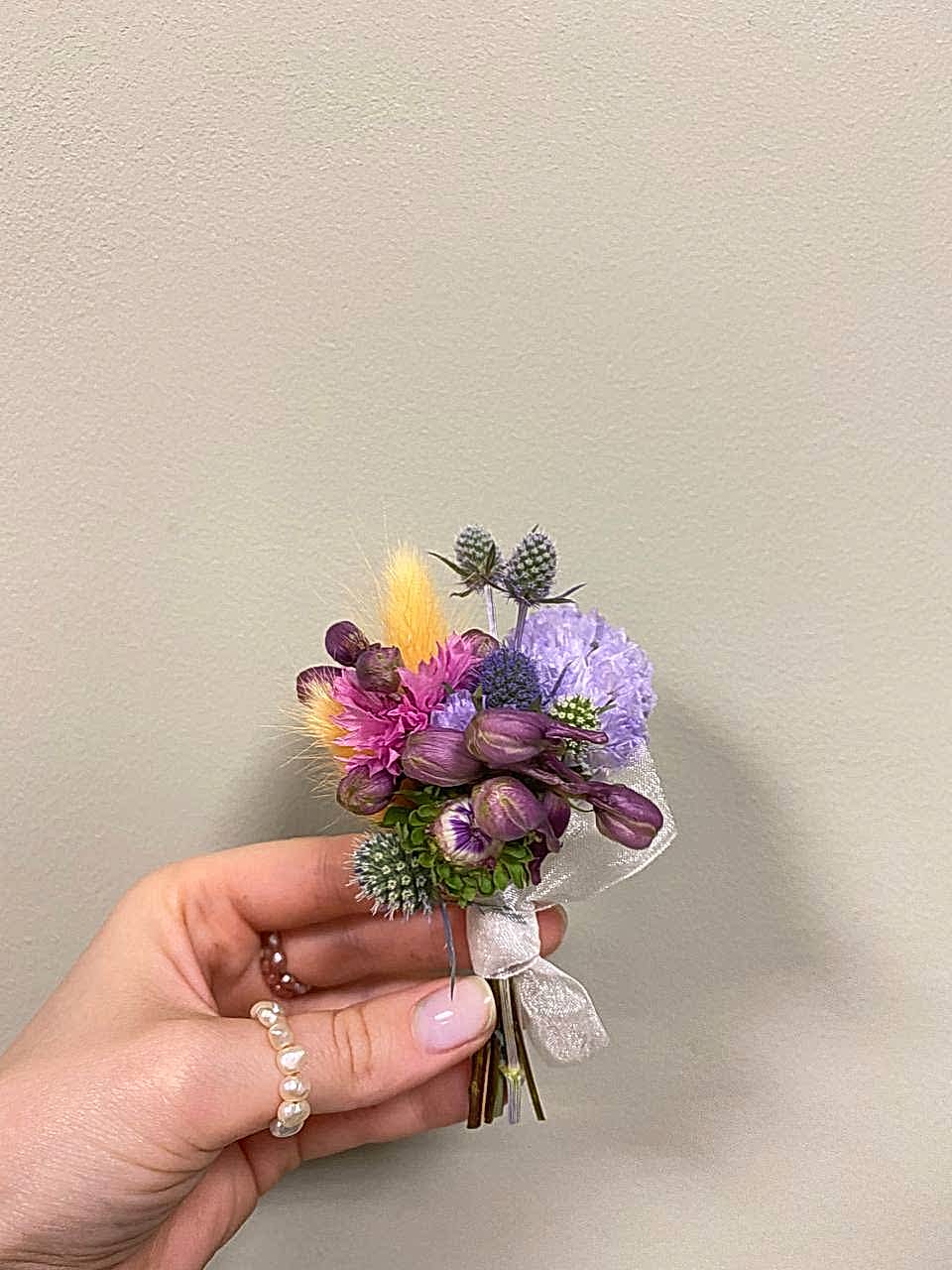 Нежный, но с характером букет с пионом, душистой маттиолой, ажурным лизантусом, кремовыми розами, акцентными колючками эрингиума и колокольчиками клематиса
