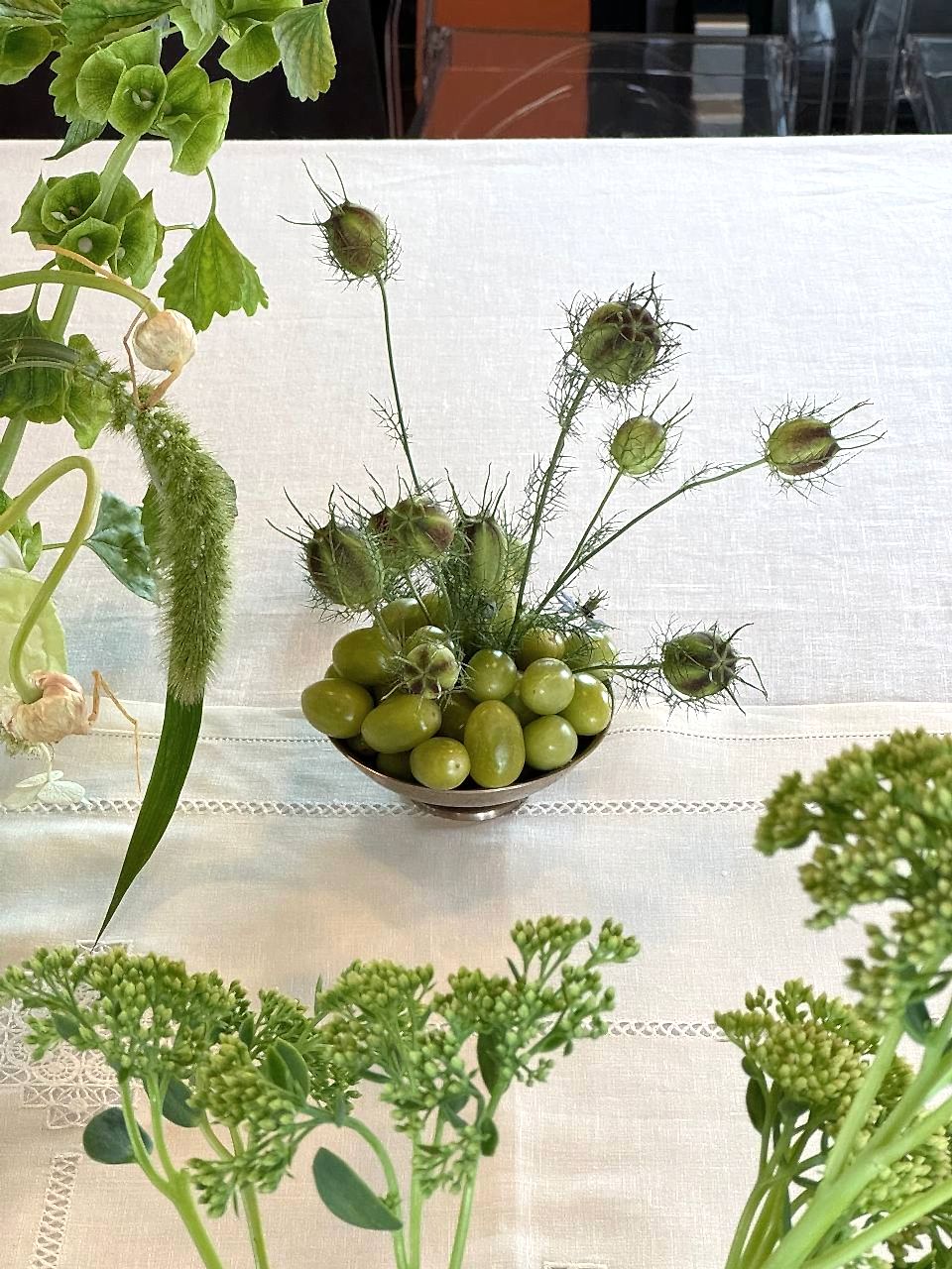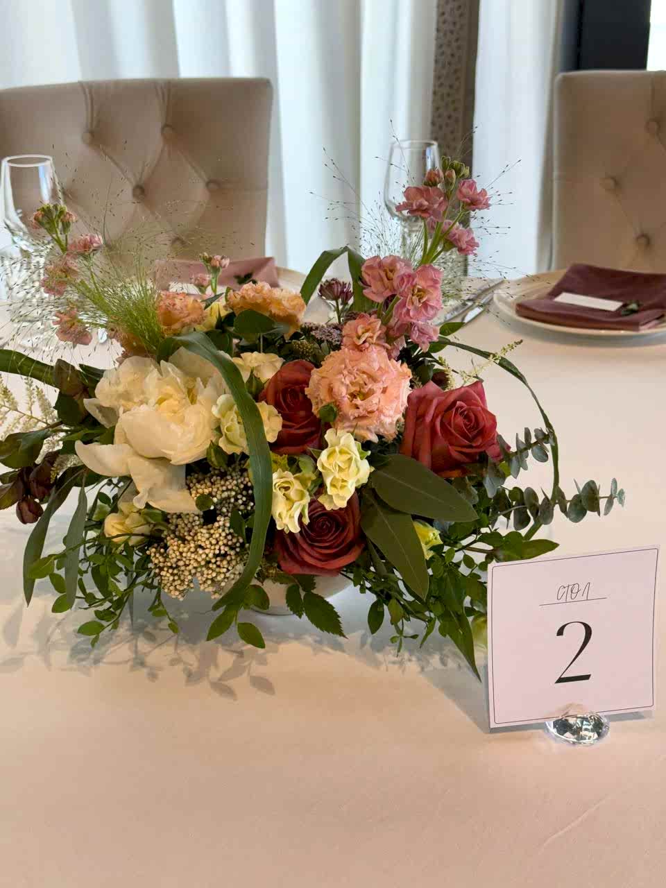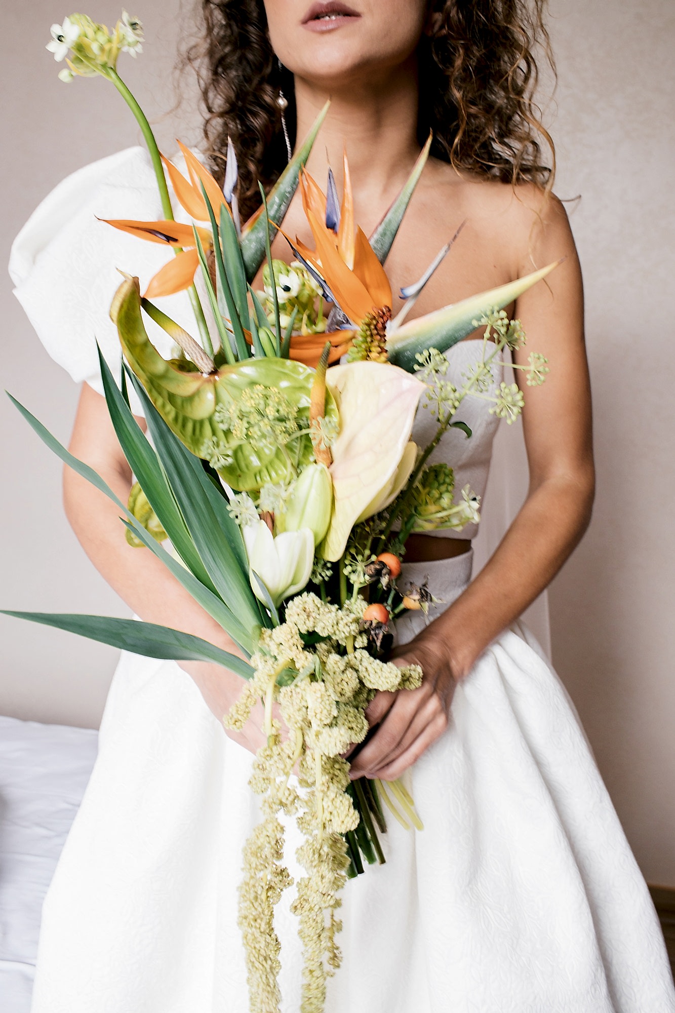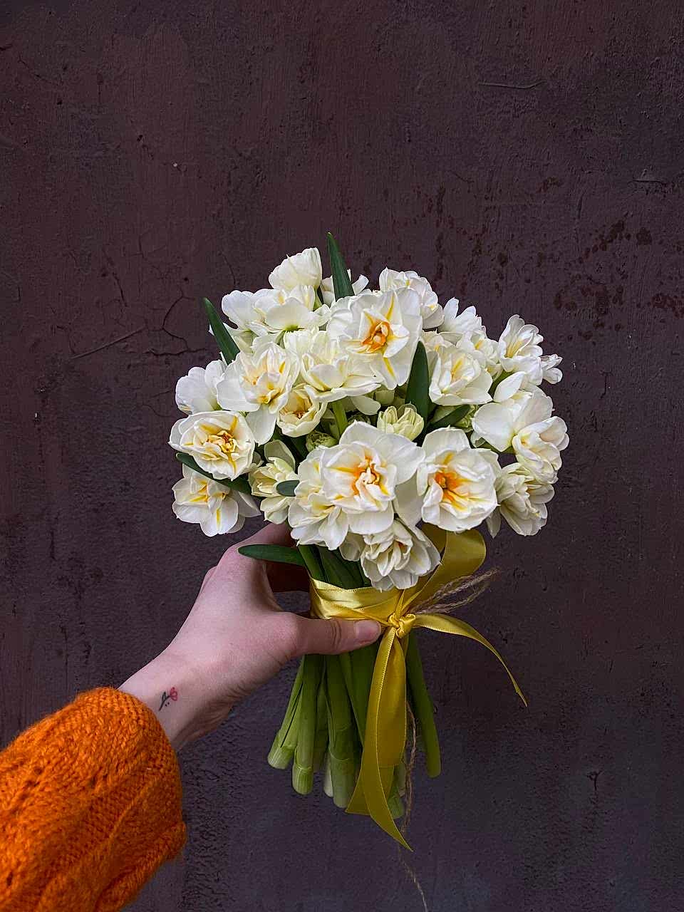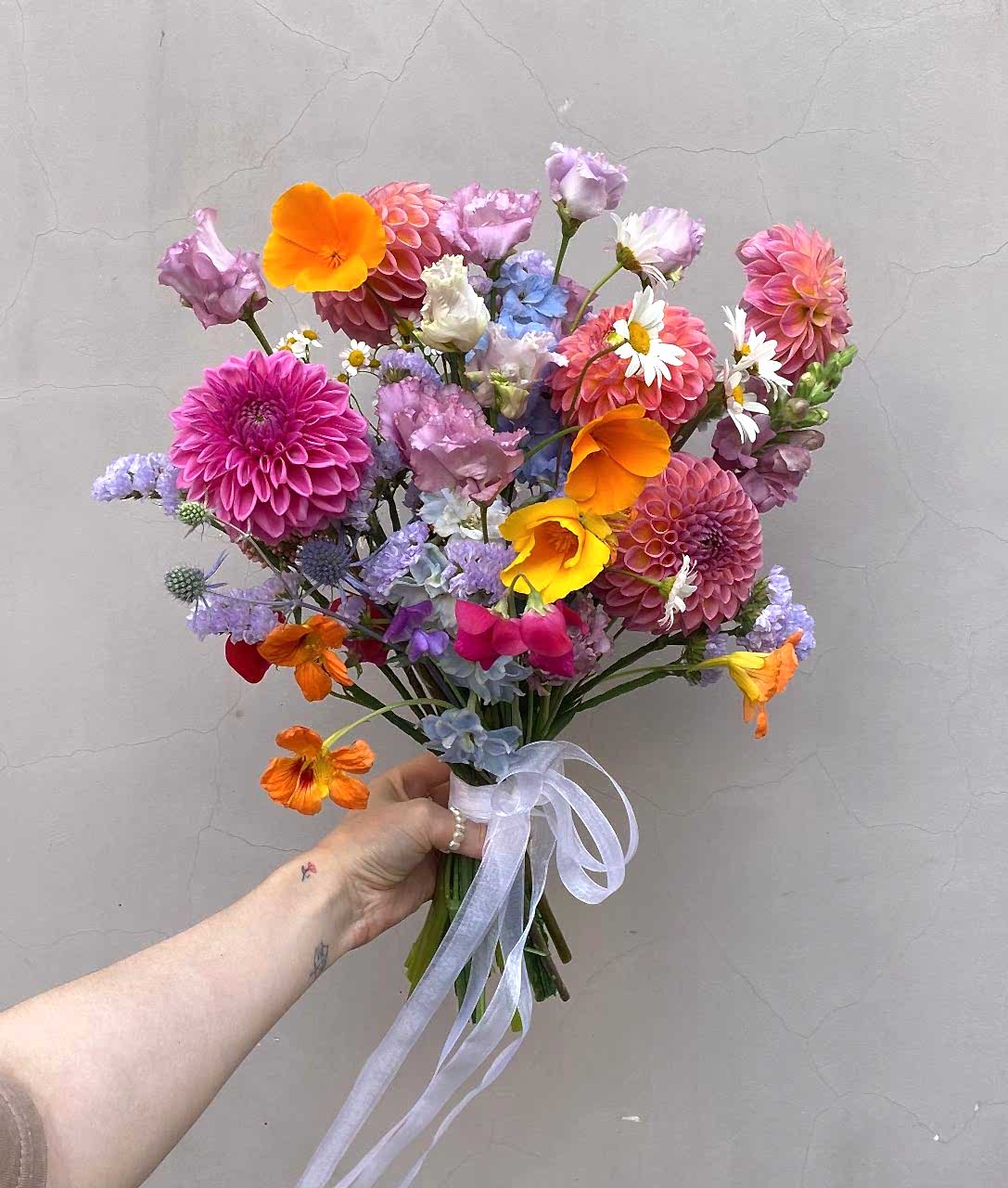 Нежный, но с характером букет с пионом, душистой маттиолой, ажурным лизантусом, кремовыми розами, акцентными колючками эрингиума и колокольчиками клематиса