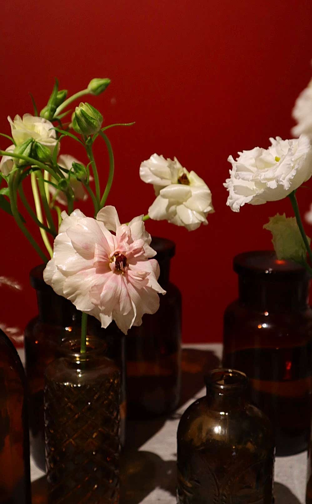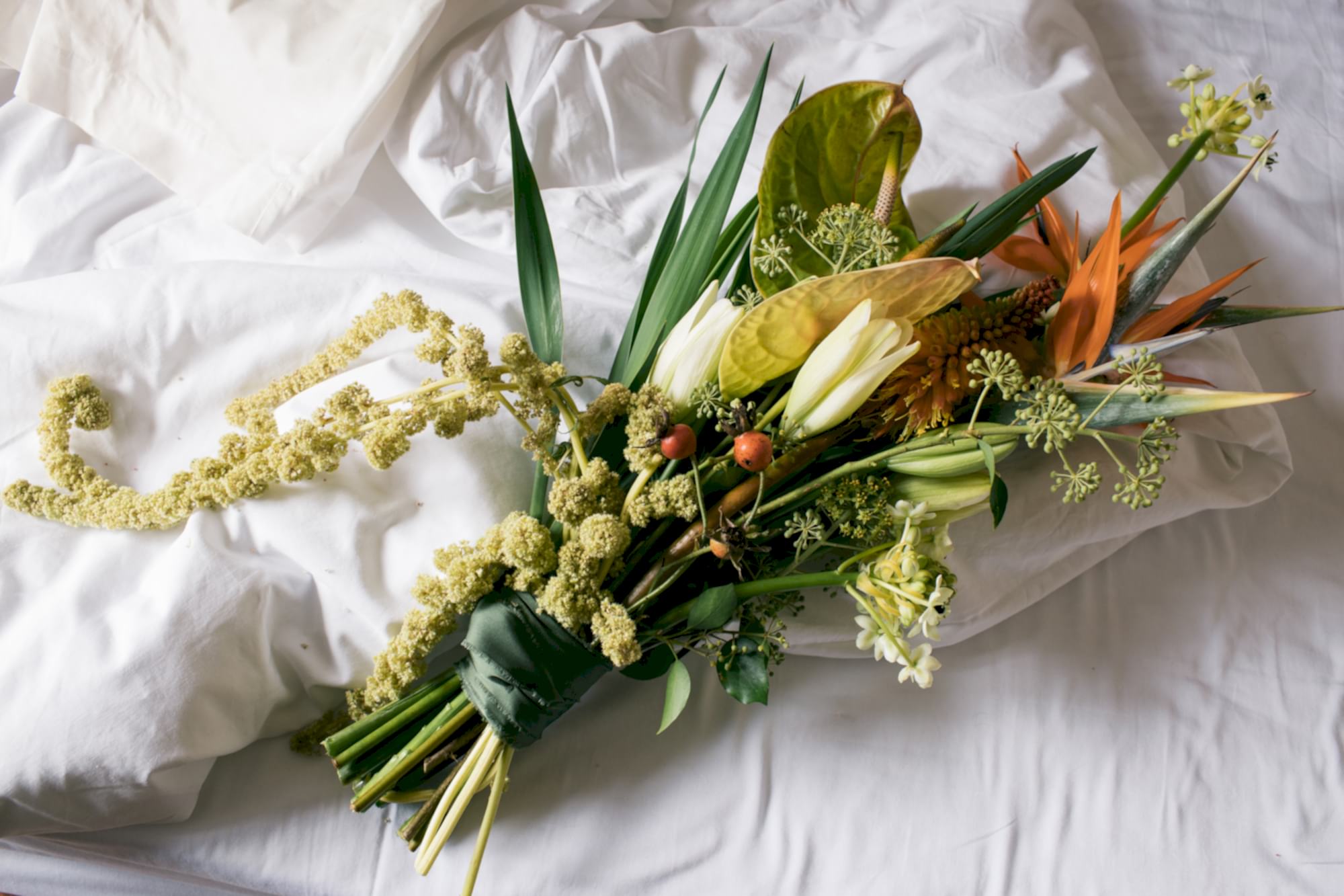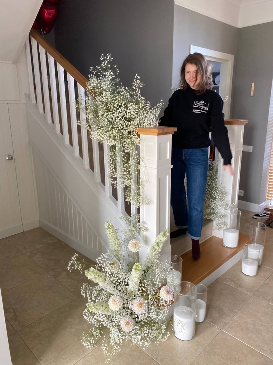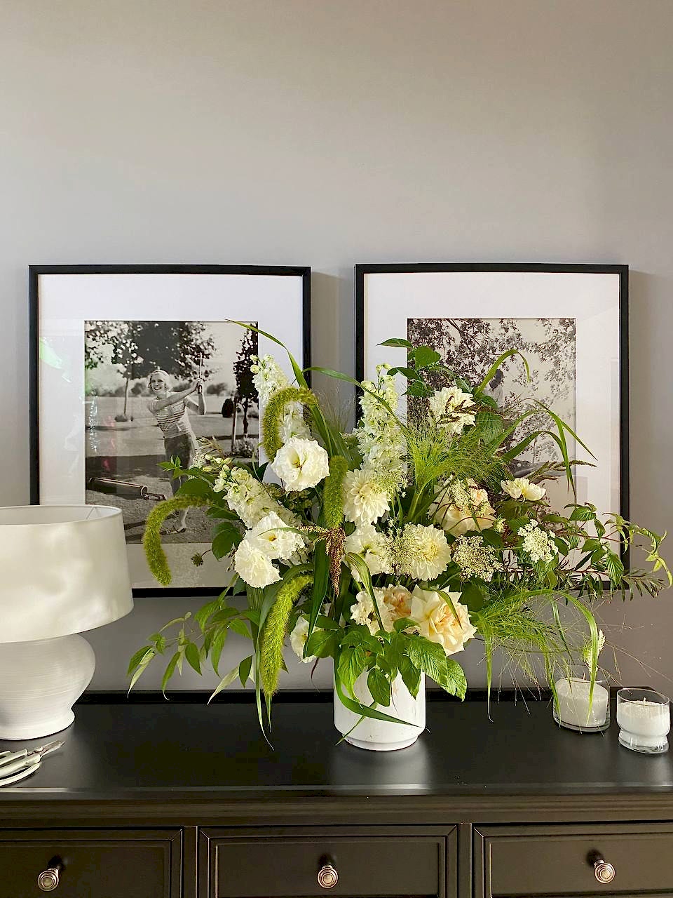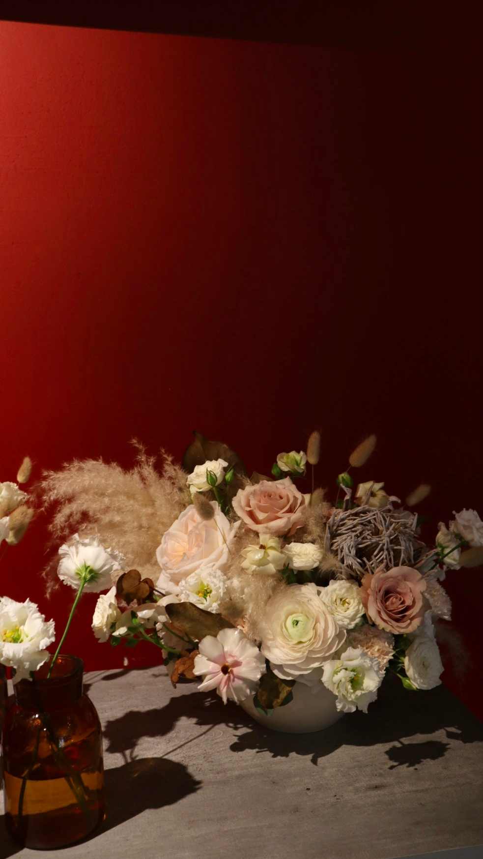 Нежный, но с характером букет с пионом, душистой маттиолой, ажурным лизантусом, кремовыми розами, акцентными колючками эрингиума и колокольчиками клематиса