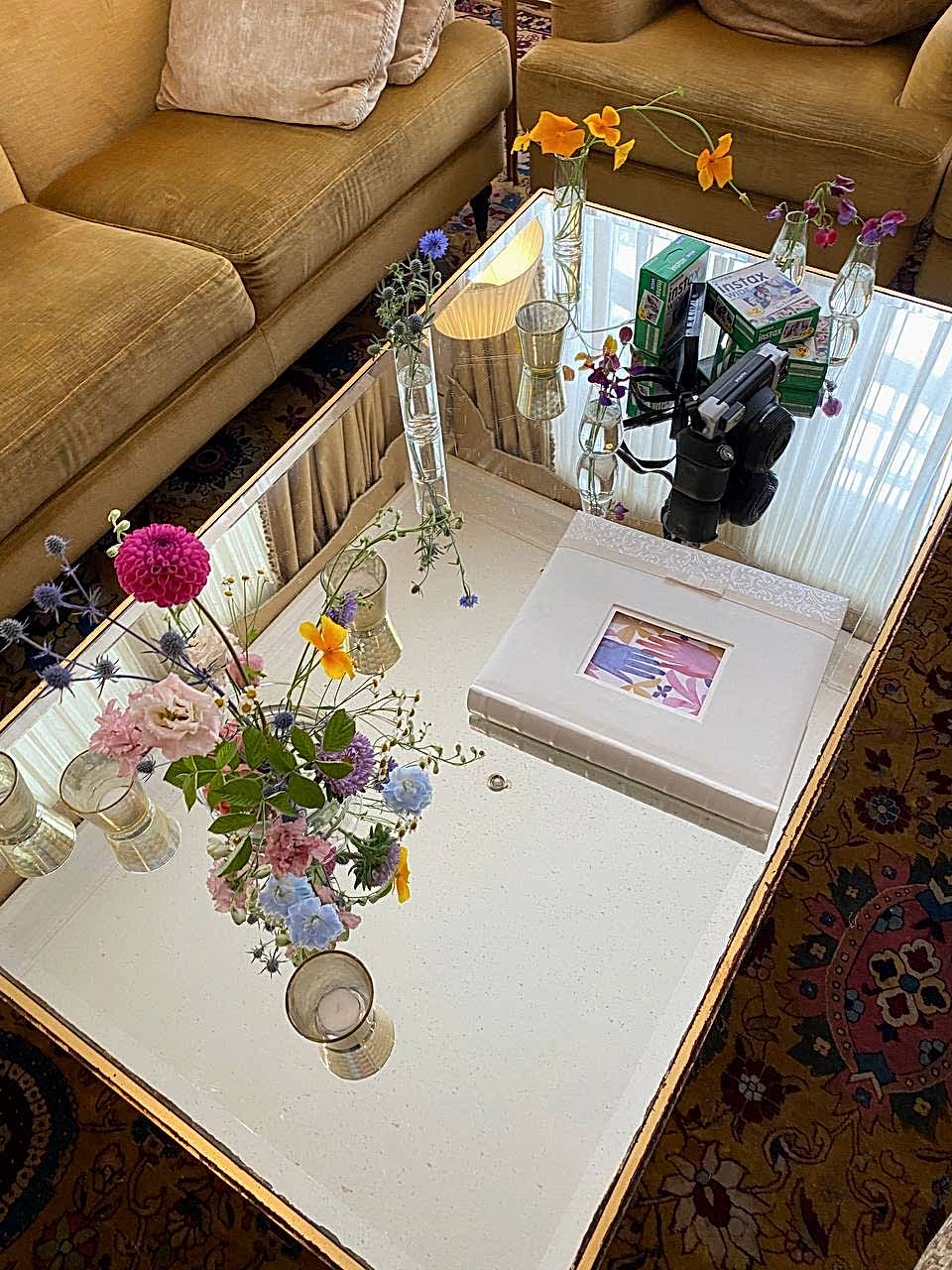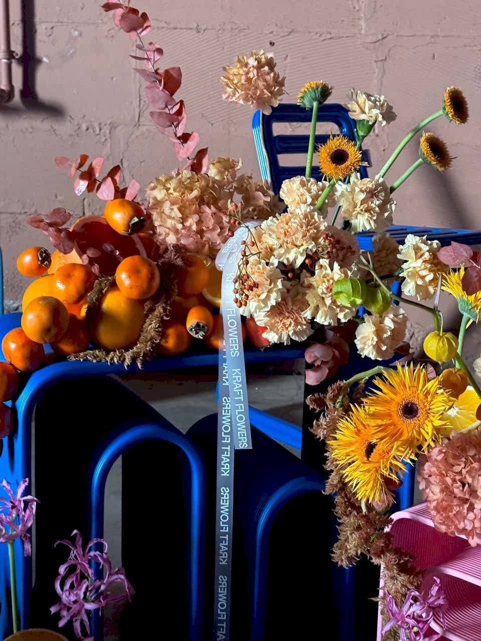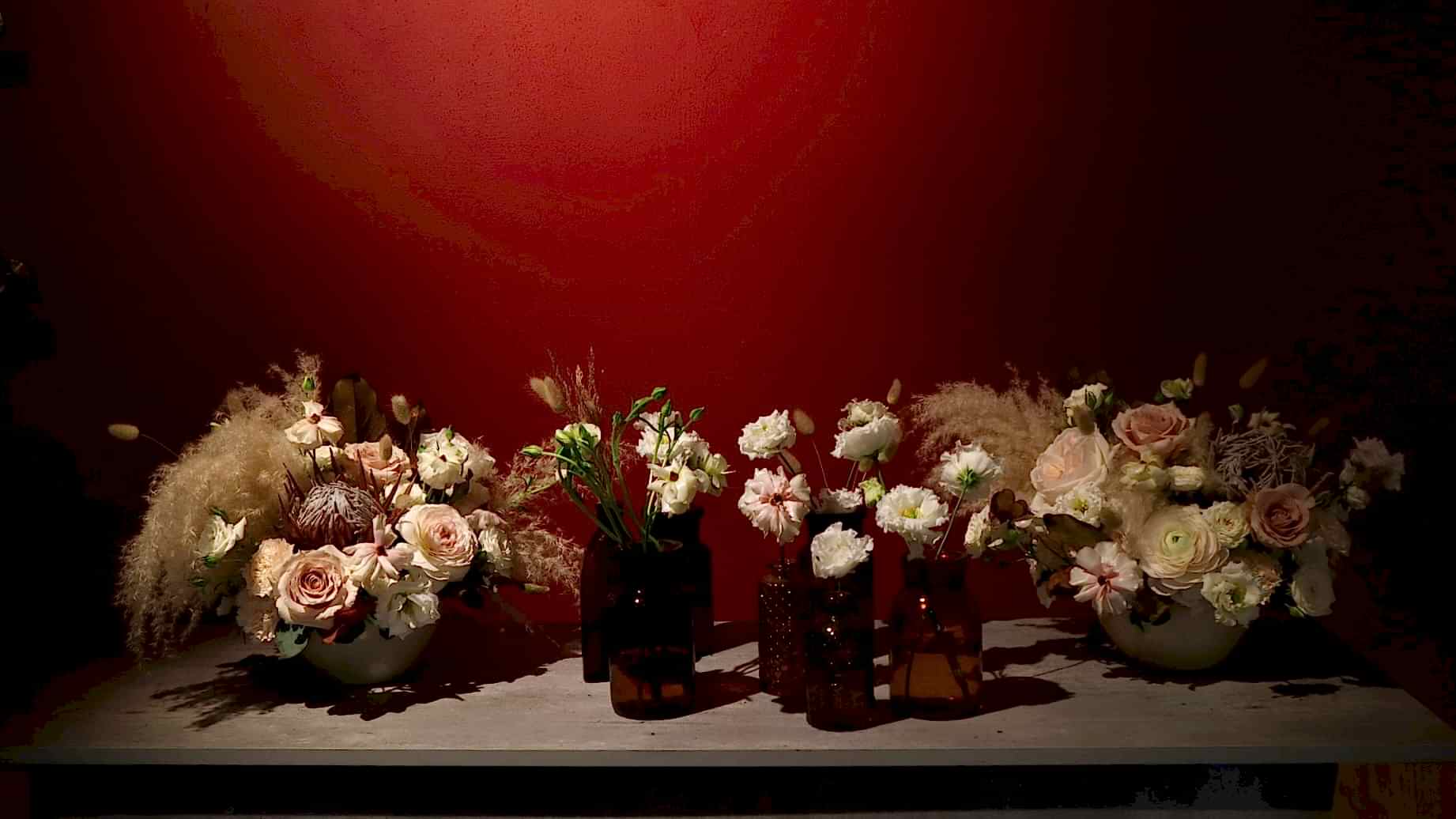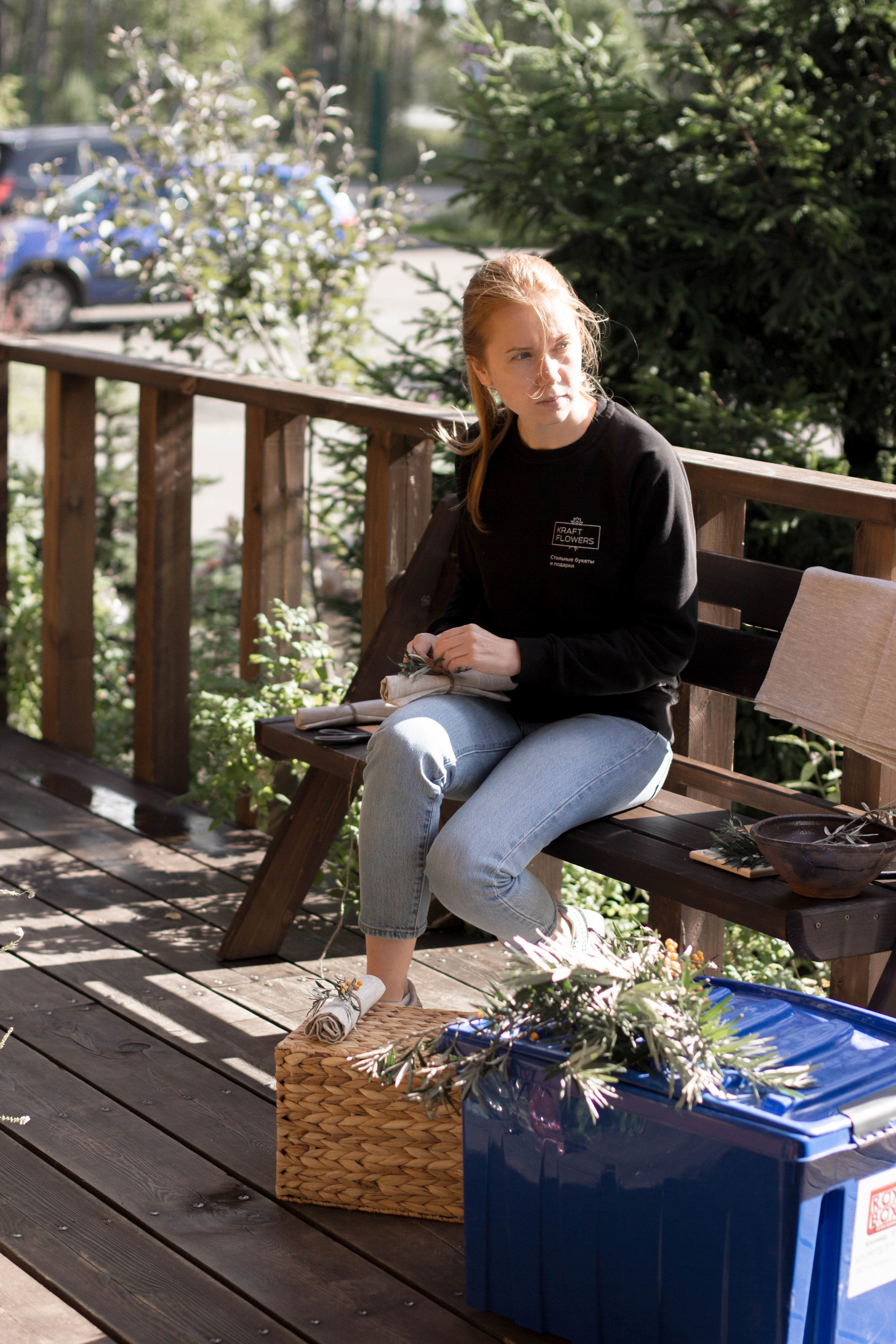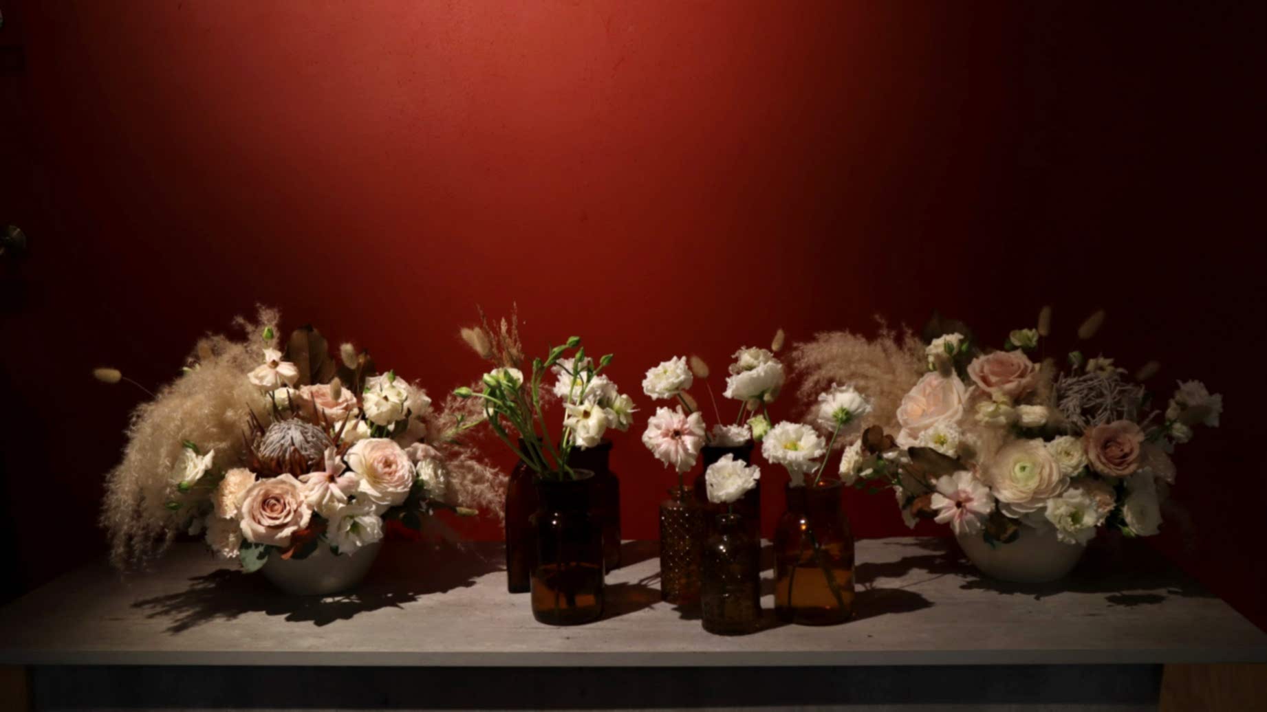 Нежный, но с характером букет с пионом, душистой маттиолой, ажурным лизантусом, кремовыми розами, акцентными колючками эрингиума и колокольчиками клематиса