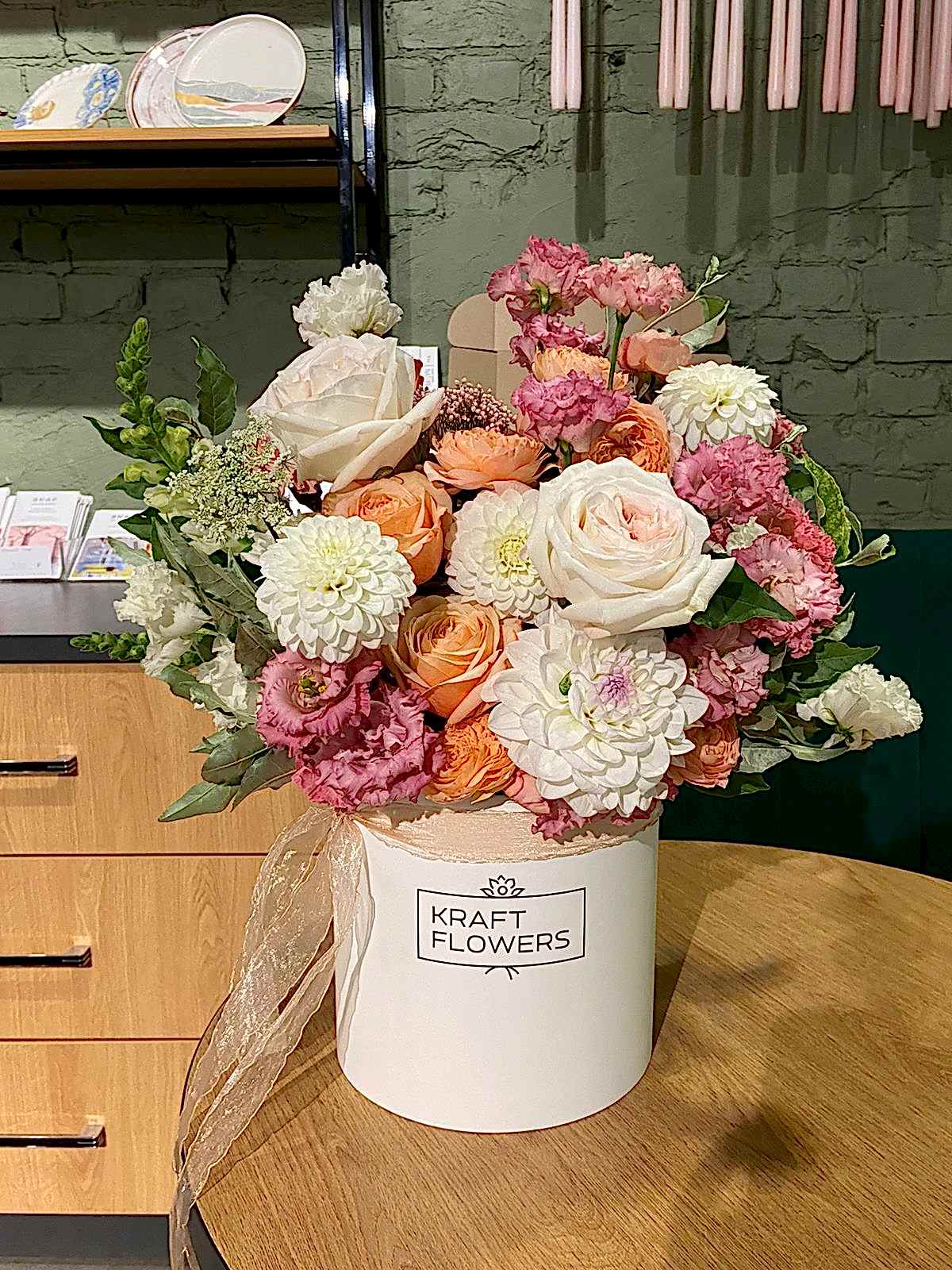 Цветочная сказка в персиково-розовых оттенках с белыми деталями. Классическая цветочная композиция, которая сможет растопить сердце любой получательницы!