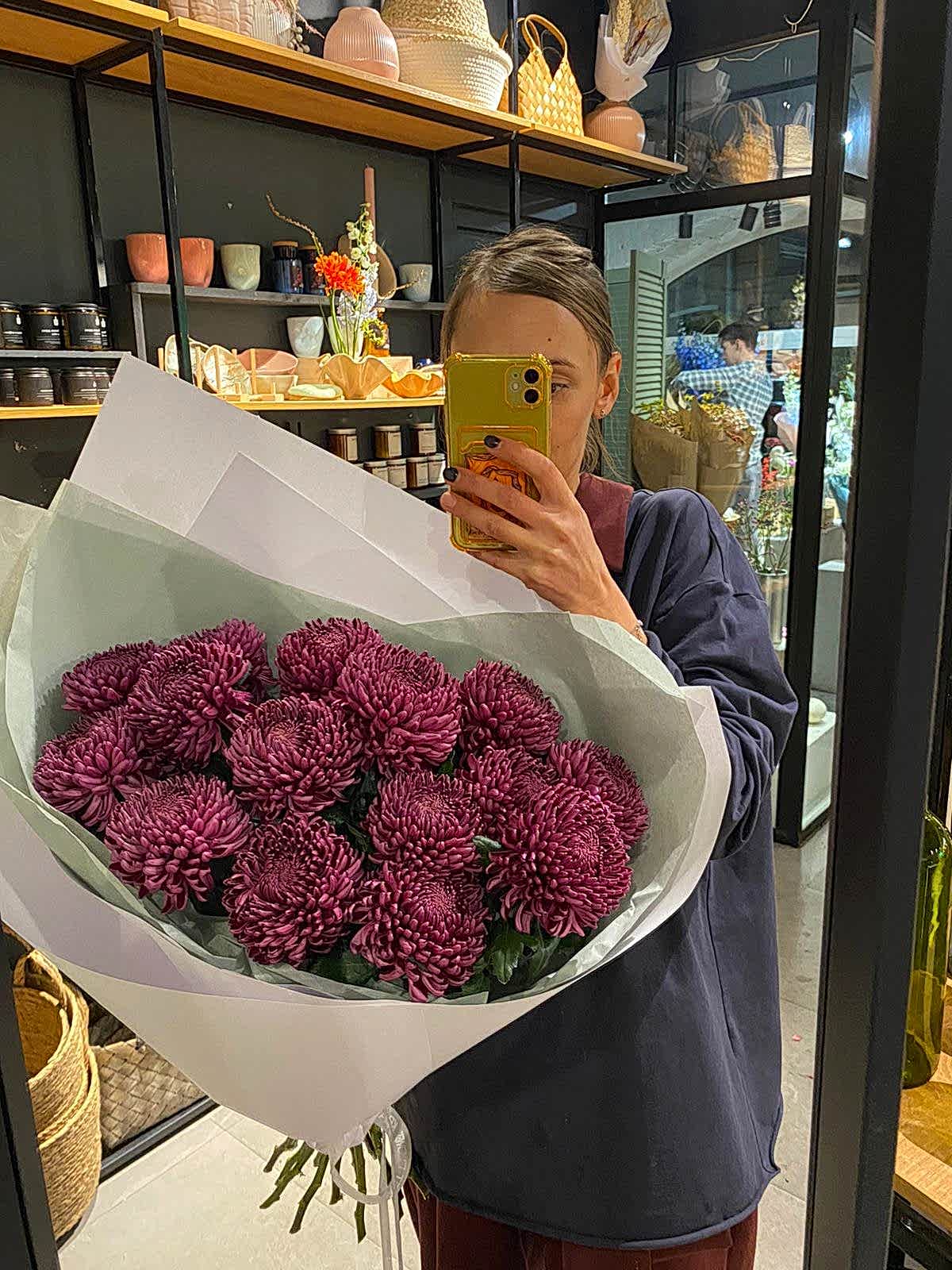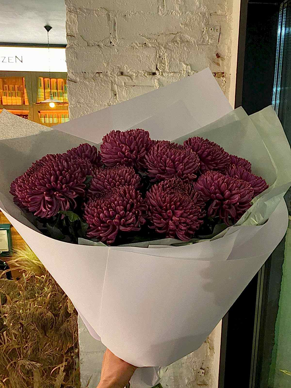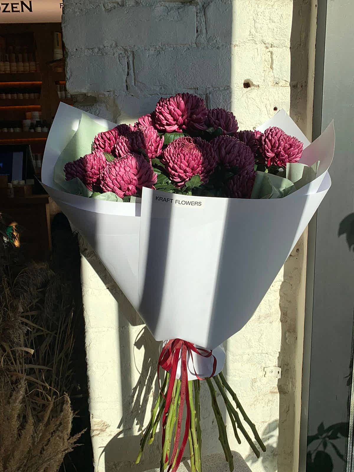 \nСтойкость цветка: средняя, выше средней. Рекомендуем аккуратно обращаться с хризантемой: у нее достаточно хрупкие лепестки, от ударов они могут осыпаться. ","category":"Выбрать букет на заказ","url":"/catalog/tsvety/khrizantema-bigoudi/","brand":{"@type":"Brand","name":"Kraft Flowers"},"sku":13891,"offers":[{"@type":"Offer","url":"/catalog/tsvety/khrizantema-bigoudi/?pid=13899","sku":"15/Пурпурный/просто в крафтовую бумагу ","priceCurrency":"RUB","price":8550,"itemCondition":"https://schema.org/NewCondition","availability":"https://schema.org/InStock","seller":{"@type":"Organization","name":"Kraft Flowers"}},{"@type":"Offer","url":"/catalog/tsvety/khrizantema-bigoudi/?pid=13903","sku":"15/Пурпурный/стильно упаковать","priceCurrency":"RUB","price":9500,"itemCondition":"https://schema.org/NewCondition","availability":"https://schema.org/InStock","seller":{"@type":"Organization","name":"Kraft Flowers"}},{"@type":"Offer","url":"/catalog/tsvety/khrizantema-bigoudi/?pid=24469","sku":"15/Красный/просто в крафтовую бумагу ","priceCurrency":"RUB","price":8550,"itemCondition":"https://schema.org/NewCondition","availability":"https://schema.org/InStock","seller":{"@type":"Organization","name":"Kraft Flowers"}},{"@type":"Offer","url":"/catalog/tsvety/khrizantema-bigoudi/?pid=24478","sku":"15/Красный/стильно упаковать","priceCurrency":"RUB","price":9500,"itemCondition":"https://schema.org/NewCondition","availability":"https://schema.org/InStock","seller":{"@type":"Organization","name":"Kraft Flowers"}},{"@type":"Offer","url":"/catalog/tsvety/khrizantema-bigoudi/?pid=13895","sku":"15/-/не упаковывать","priceCurrency":"RUB","price":9500,"itemCondition":"https://schema.org/NewCondition","availability":"https://schema.org/InStock","seller":{"@type":"Organization","name":"Kraft Flowers"}},{"@type":"Offer","url":"/catalog/tsvety/khrizantema-bigoudi/?pid=24420","sku":"25/Пурпурный/стильно упаковать","priceCurrency":"RUB","price":15150,"itemCondition":"https://schema.org/NewCondition","availability":"https://schema.org/InStock","seller":{"@type":"Organization","name":"Kraft Flowers"}},{"@type":"Offer","url":"/catalog/tsvety/khrizantema-bigoudi/?pid=24473","sku":"25/Пурпурный/просто в крафтовую бумагу ","priceCurrency":"RUB","price":14250,"itemCondition":"https://schema.org/NewCondition","availability":"https://schema.org/InStock","seller":{"@type":"Organization","name":"Kraft Flowers"}},{"@type":"Offer","url":"/catalog/tsvety/khrizantema-bigoudi/?pid=24474","sku":"25/Красный/просто в крафтовую бумагу ","priceCurrency":"RUB","price":14250,"itemCondition":"https://schema.org/NewCondition","availability":"https://schema.org/InStock","seller":{"@type":"Organization","name":"Kraft Flowers"}}]}