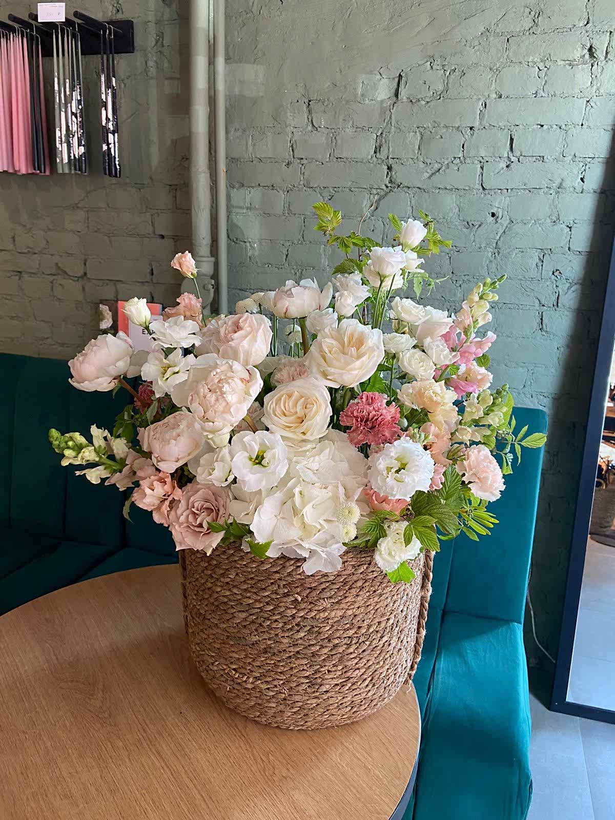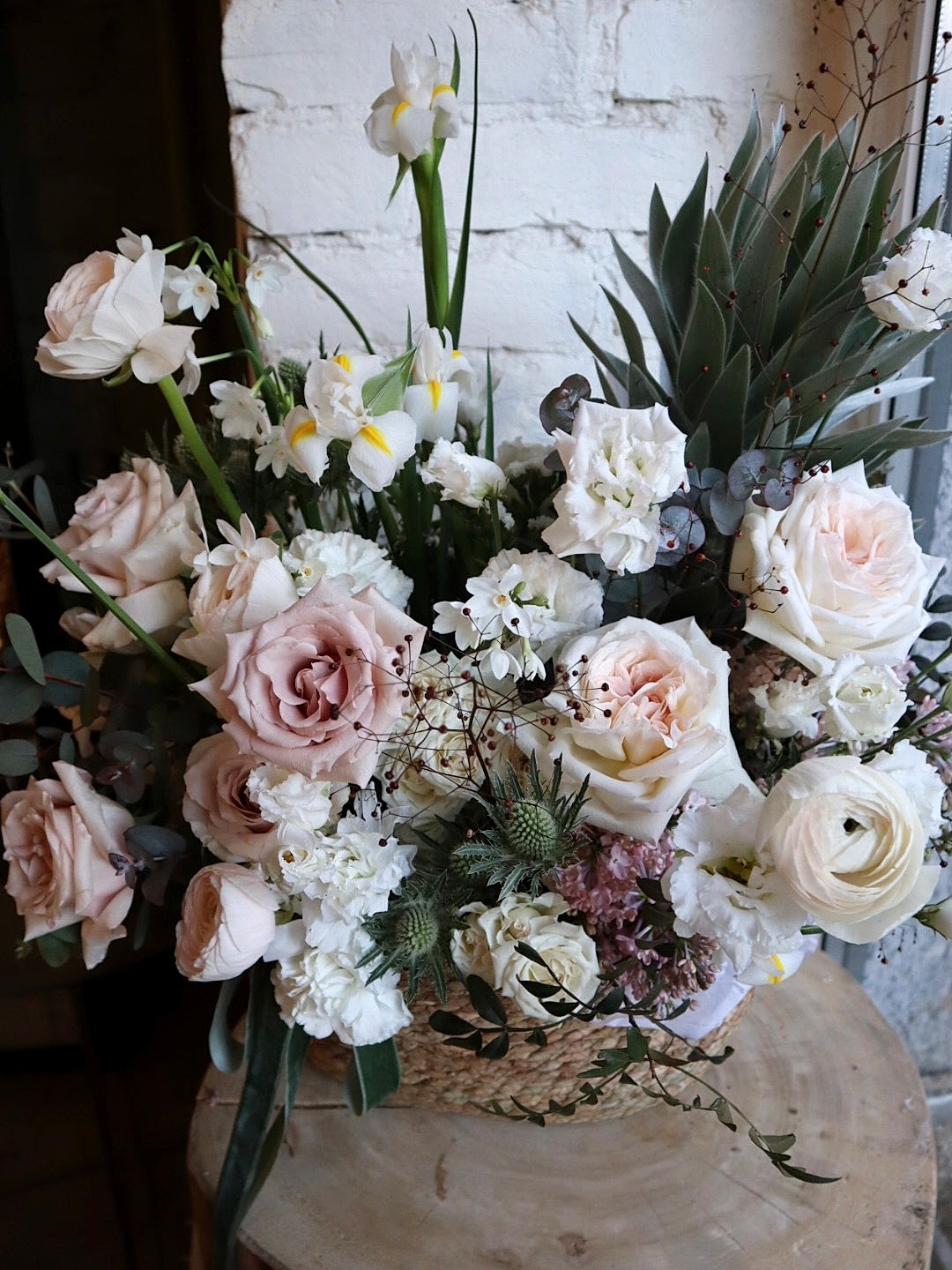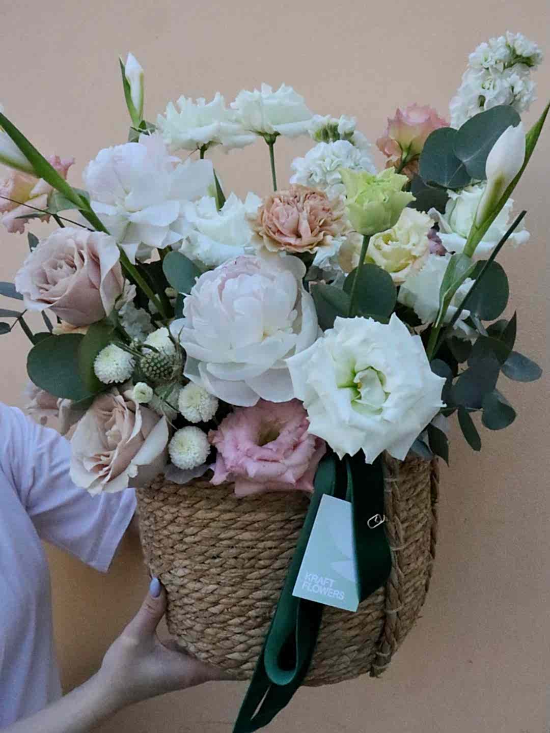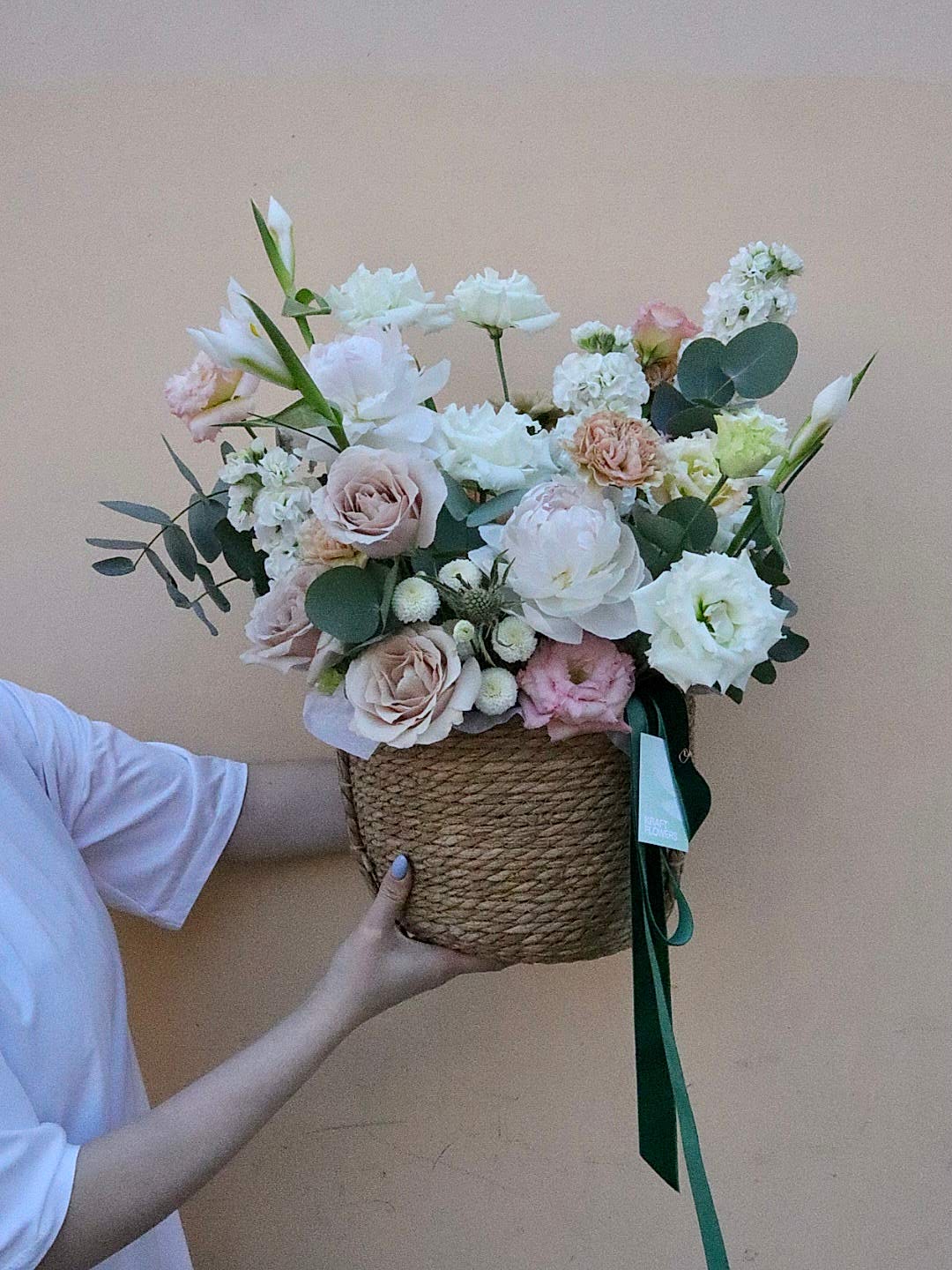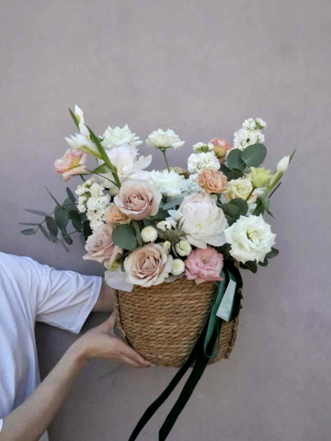 Потрясающая корзина с сезонными цветами студии в молочных, кремовых и пудровых оттенках.