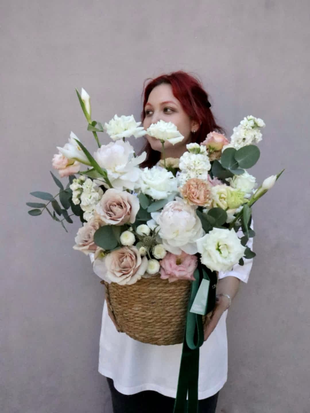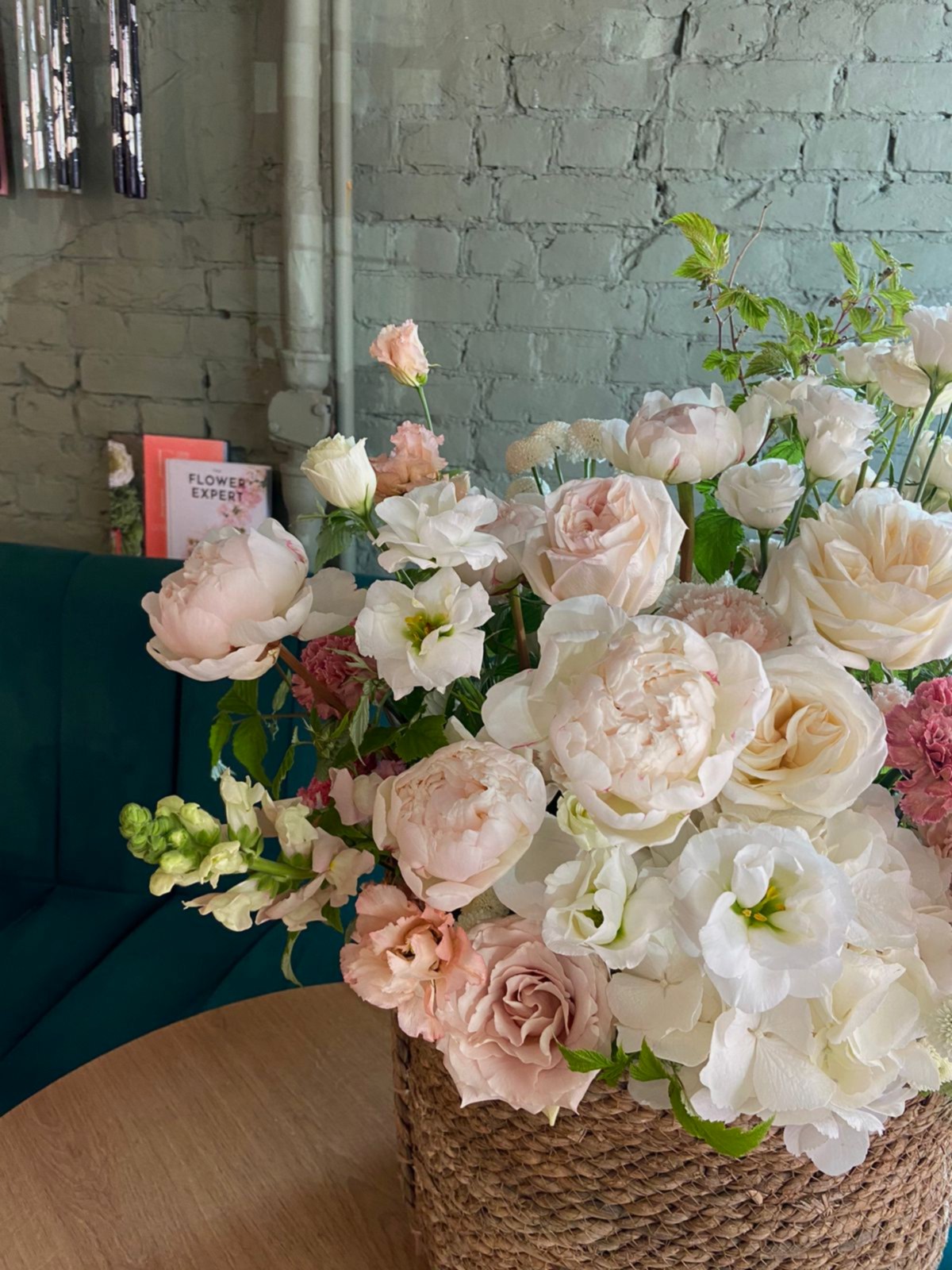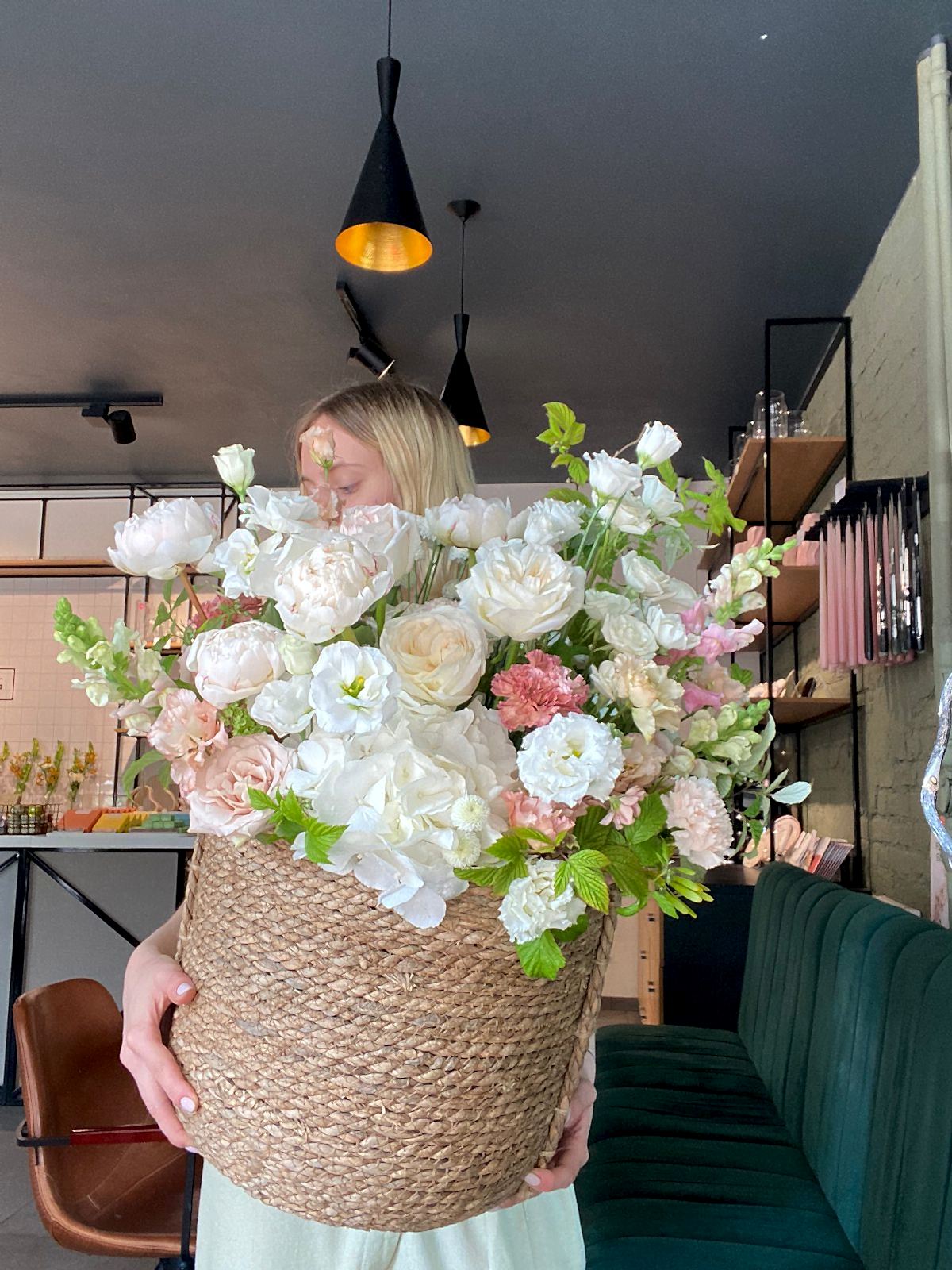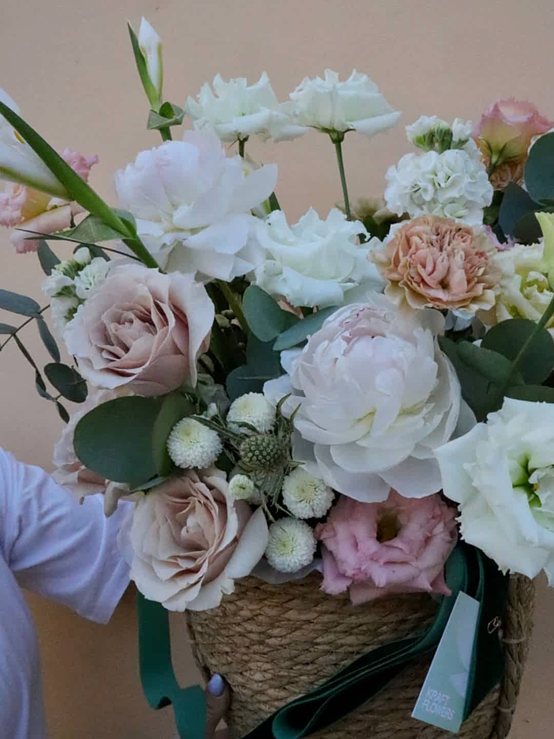 Потрясающая корзина с сезонными цветами студии в молочных, кремовых и пудровых оттенках.