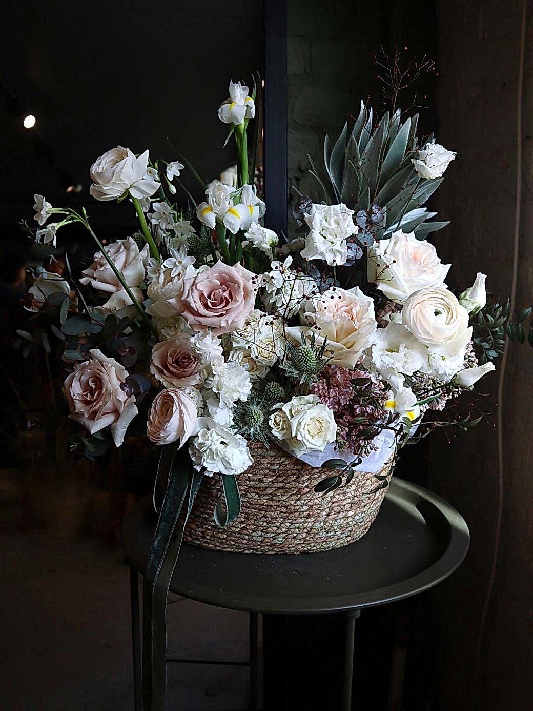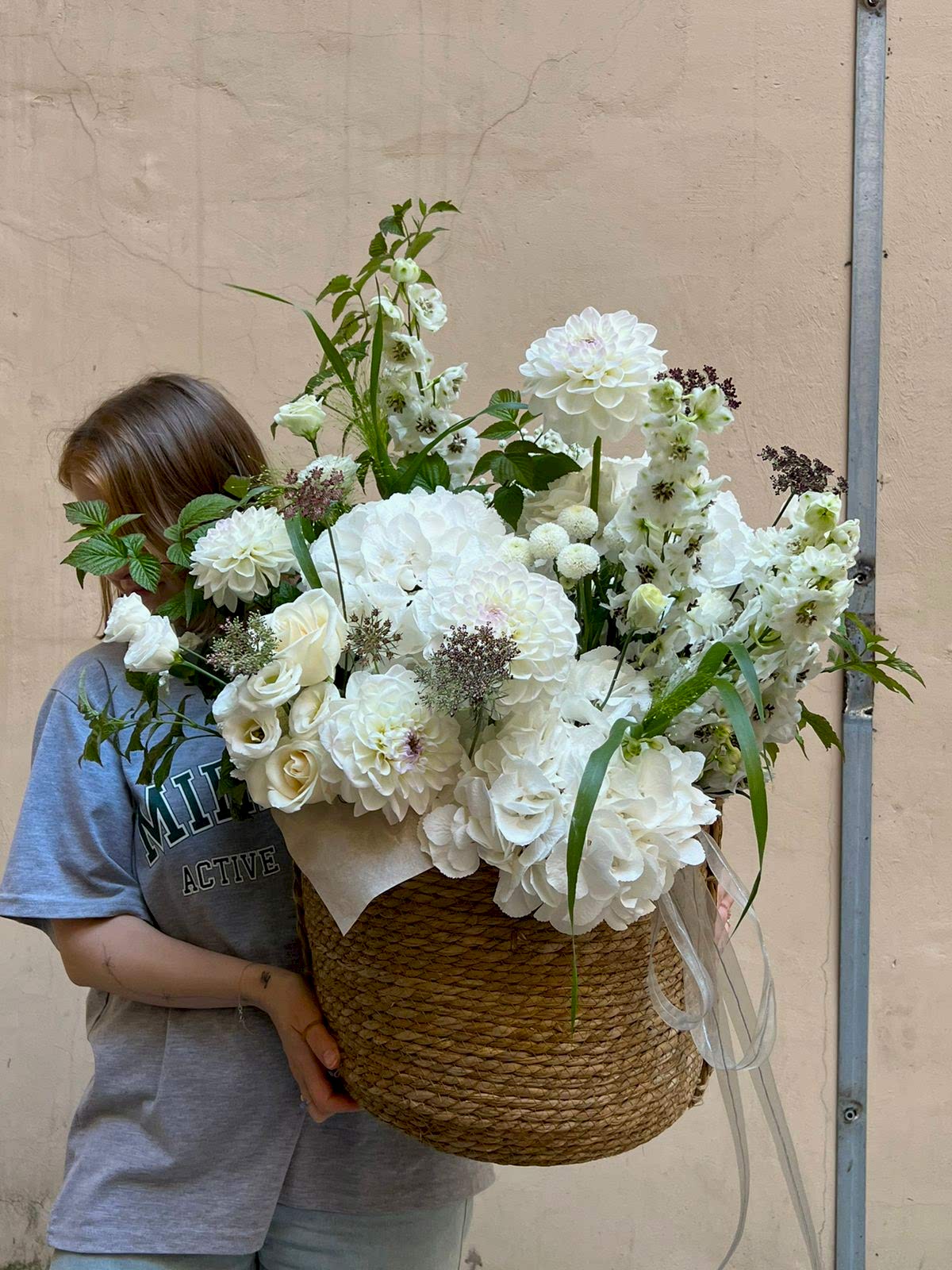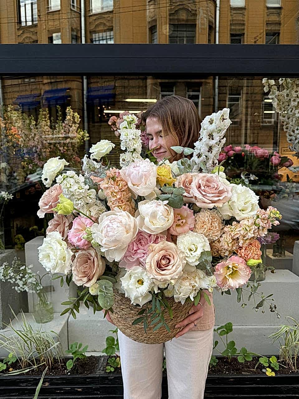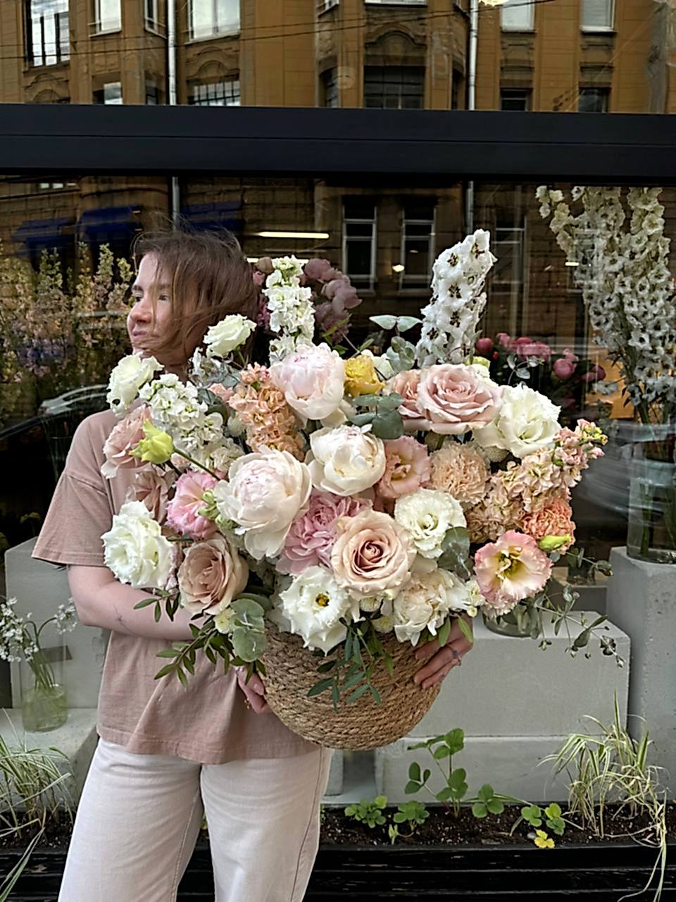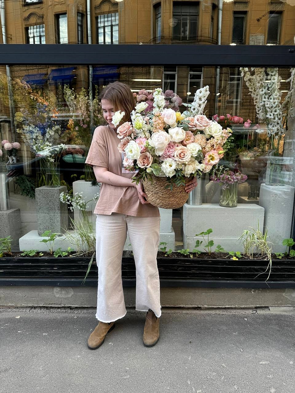 Потрясающая корзина с сезонными цветами студии в молочных, кремовых и пудровых оттенках.