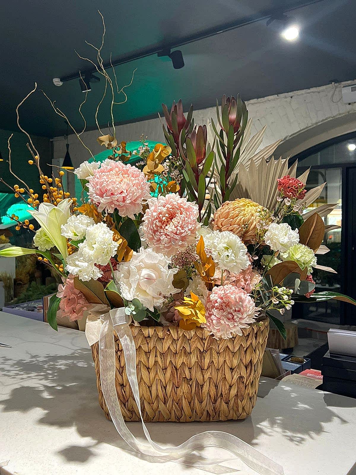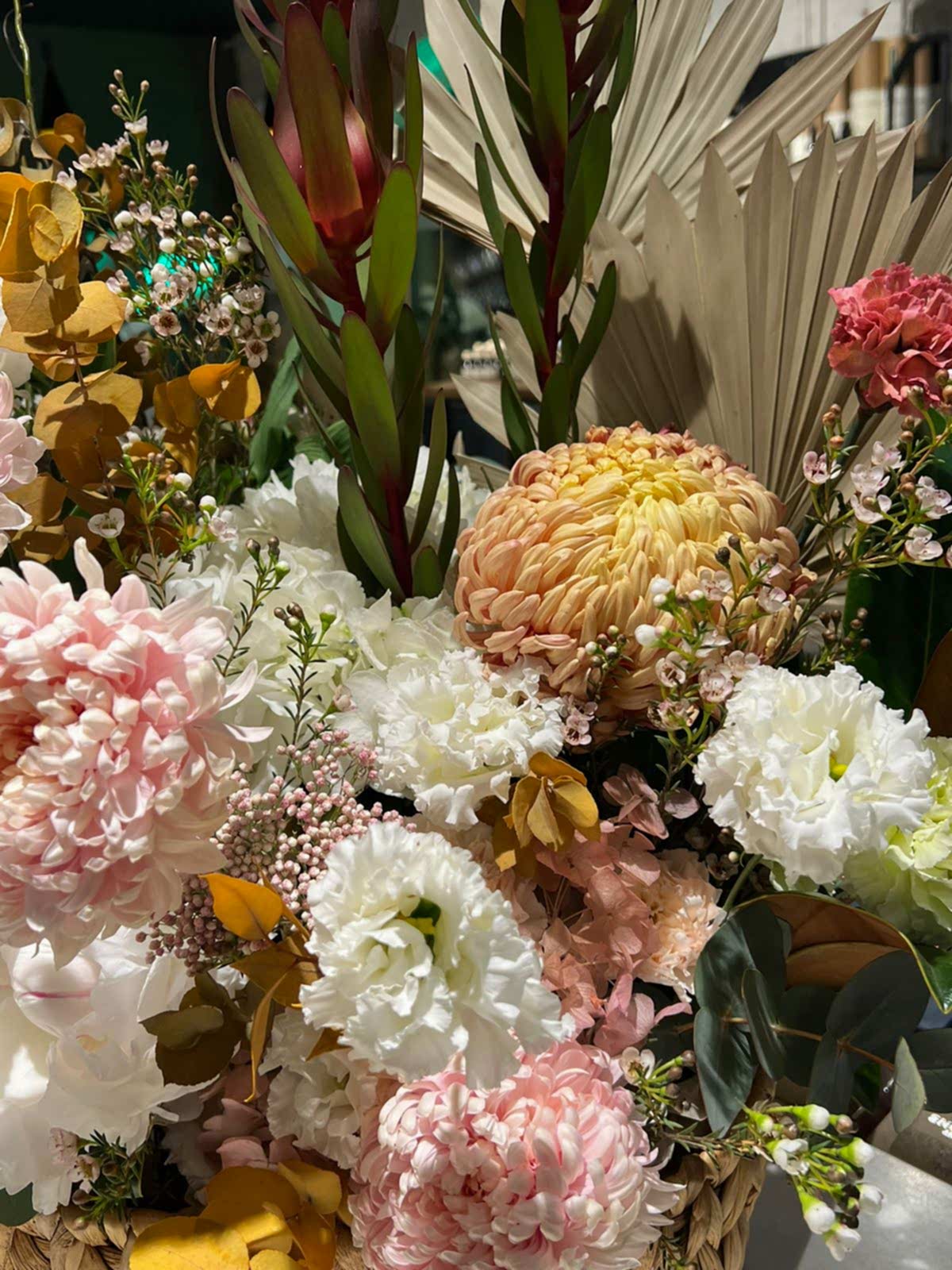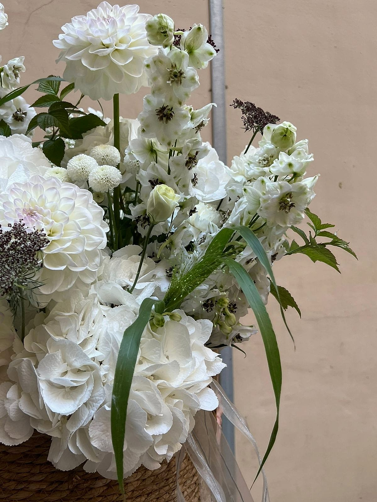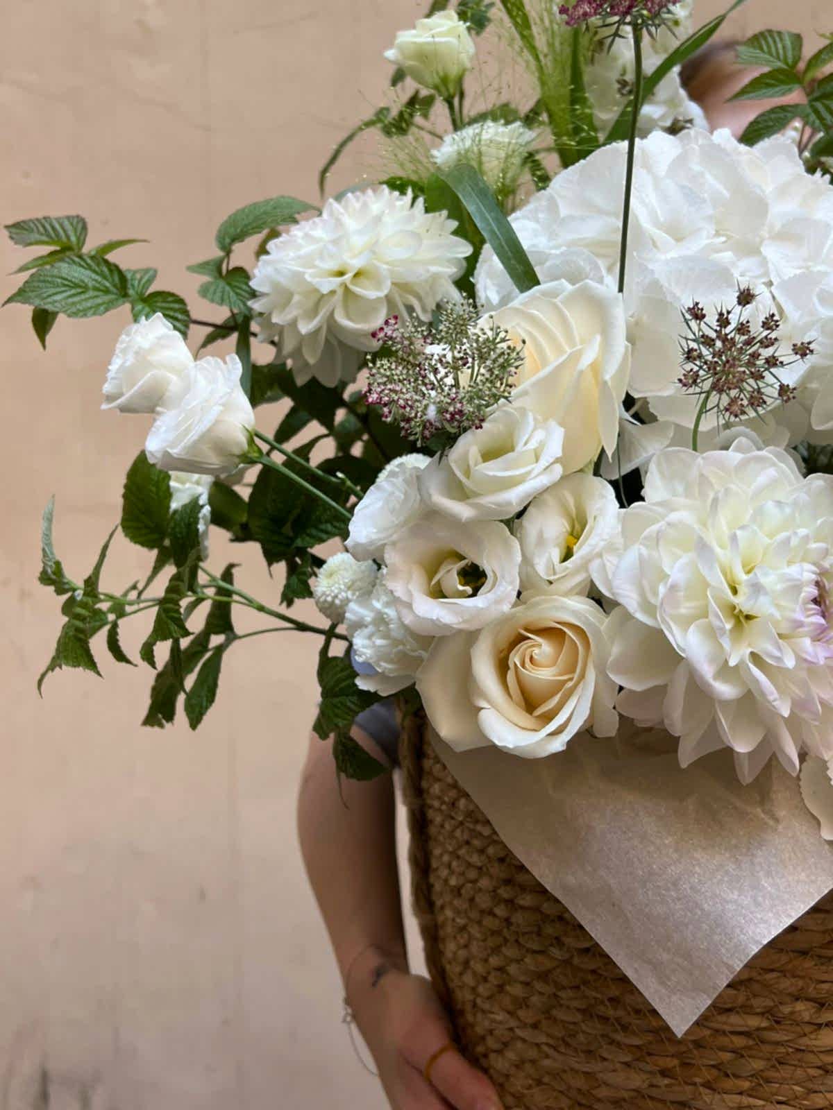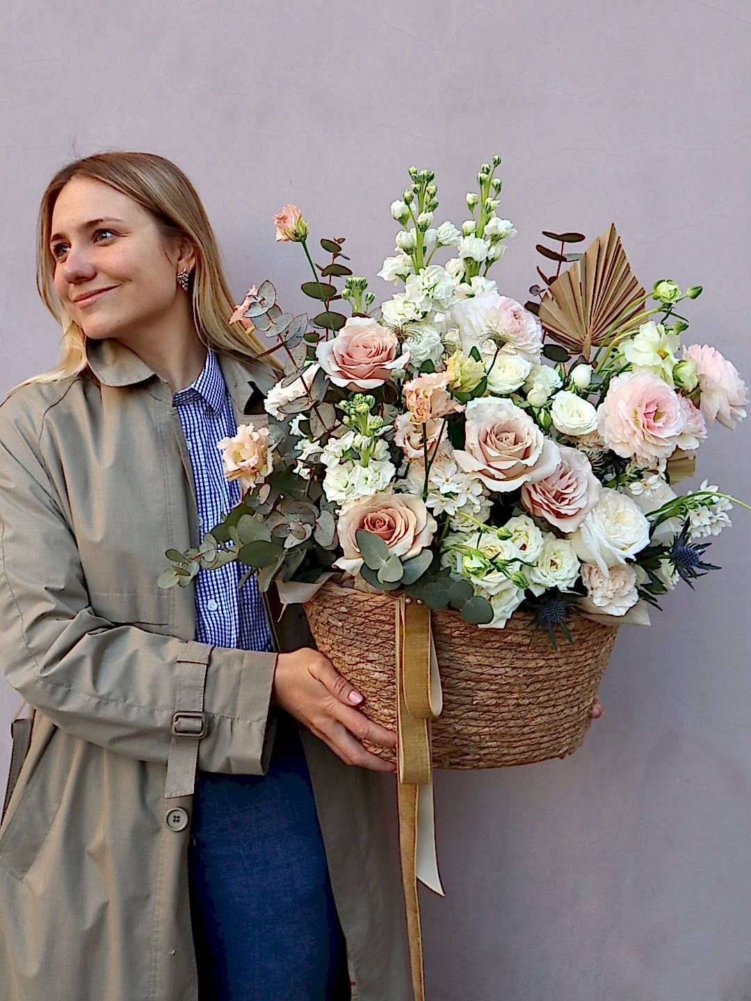 Потрясающая корзина с сезонными цветами студии в молочных, кремовых и пудровых оттенках.